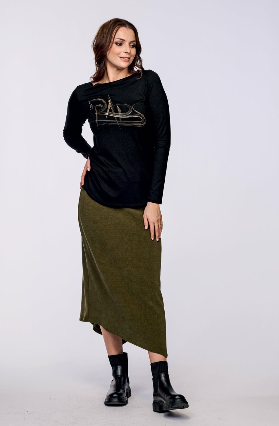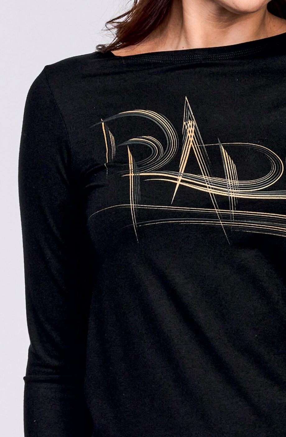 Dámská delší halenka DRAPS s dlouhým rukávem a lodičkový výstřihem. Přední díl je zdobený kontrastním potiskem a délka je ukončena do oblouku.
