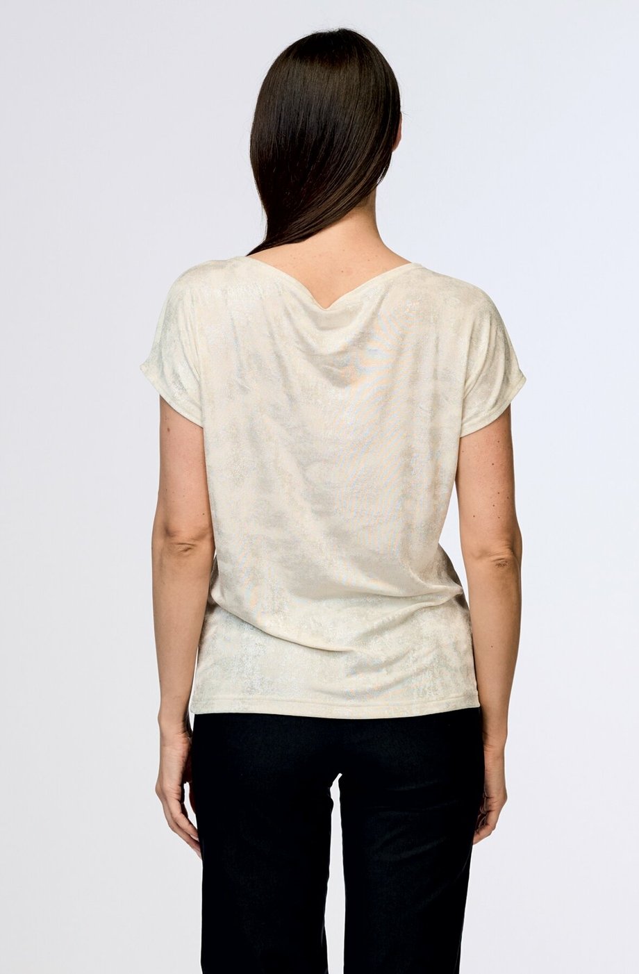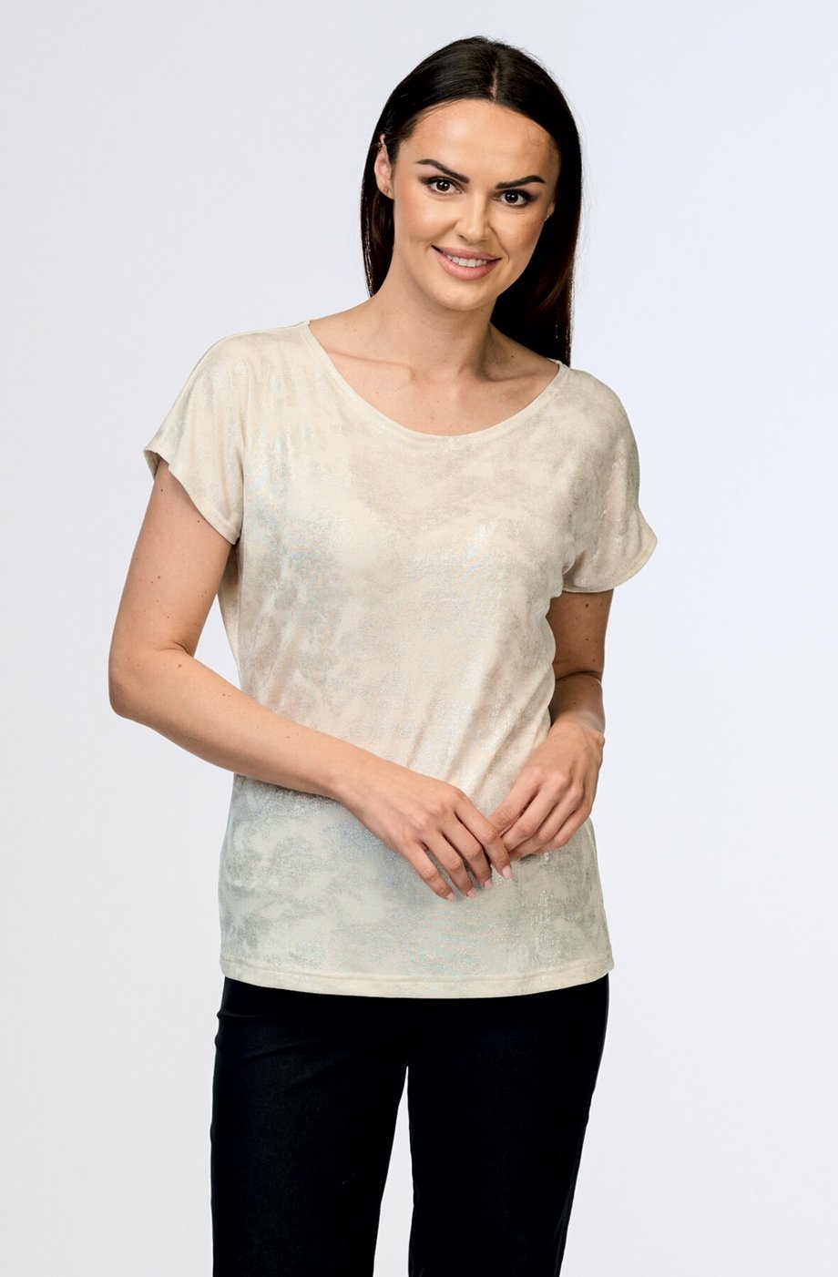 Dámská halenka DRAPS kimonového střihu s krátkými spadlými rukávy s lesklým stříbrným vzorem na smetanovém základě.