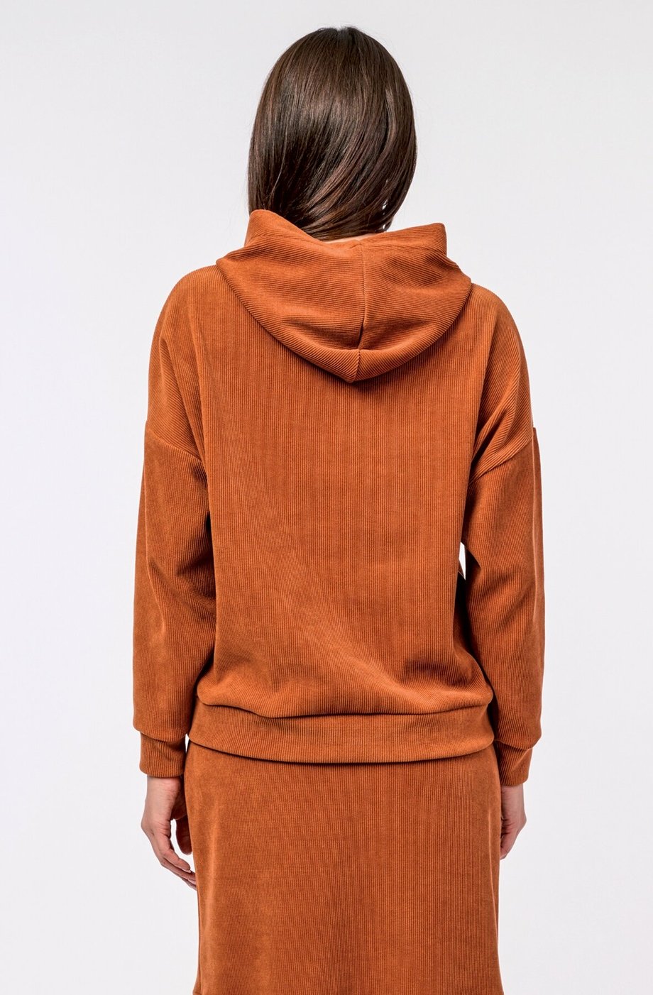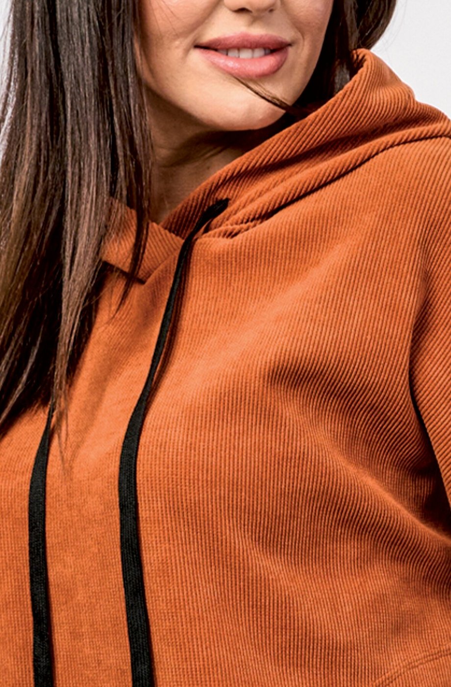 Dámská volnější oversize mikina DRAPS s kapucí a dvěma kapsami ze zajímavého vroubkovaného materiálu. Rukávy a spodní lem jsou ukončeny do lemu.