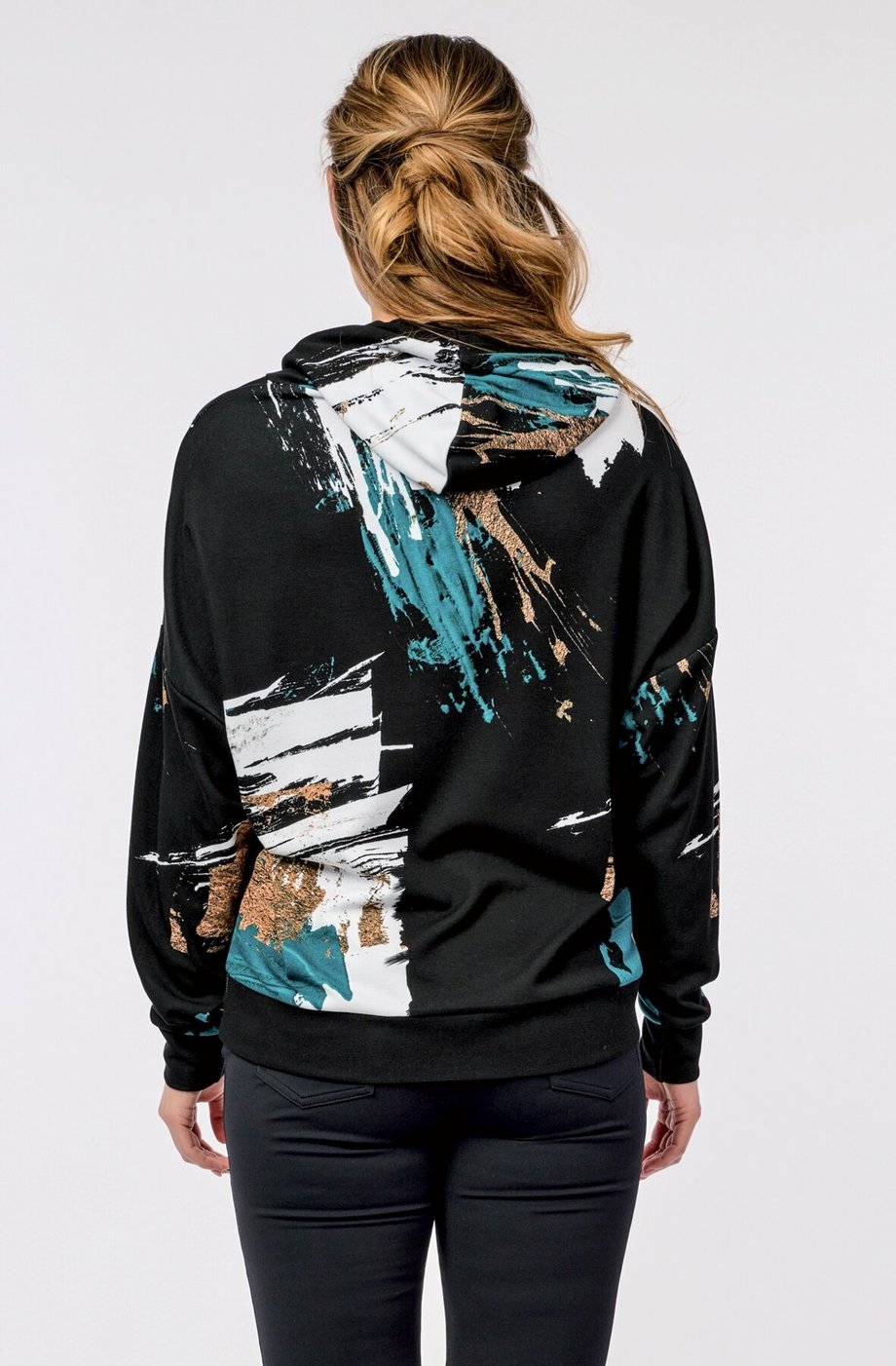 Dámská volnější mikina DRAPS s kapucí a dvěma kapsami. Rukávy a spodní lem jsou ukončeny do lemu.