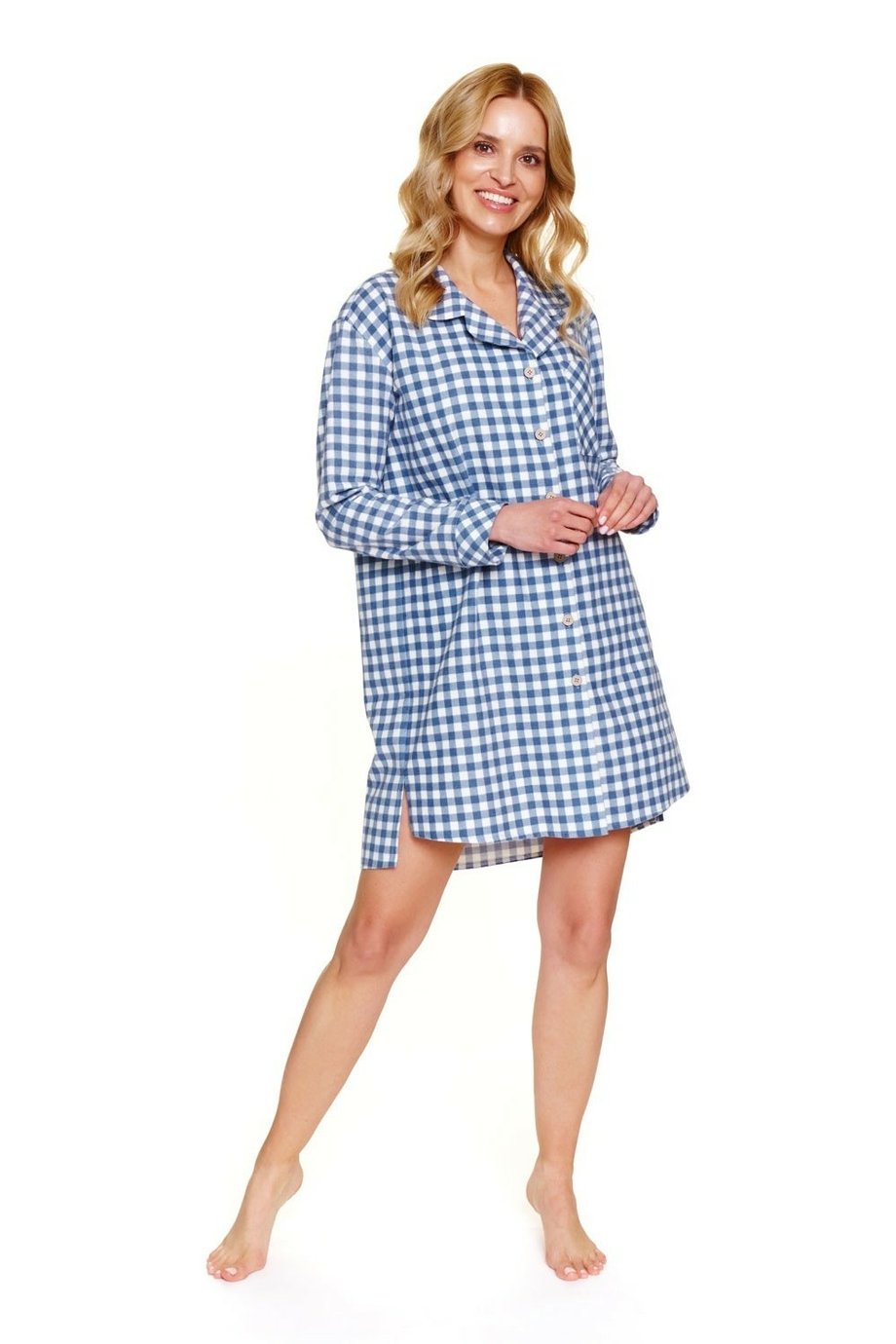 Dámská kratší flanelová celorozepínací noční košile DOCTOR NAP s límečkem, dlouhým rukávem a kapsami ve švech. Vhodná i jako domácí šaty.
