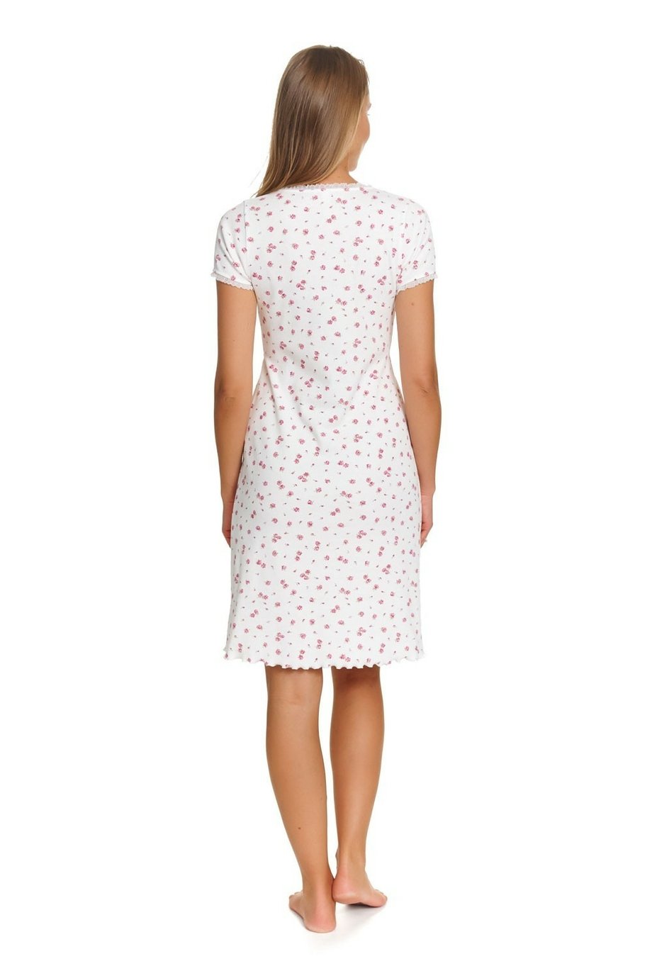 Dámská noční košile DOCTOR NAP s krátkým rukávem a překládaným výstřihem do V s tiskem drobných květů na bílém základě z žebrované bavlny. Výstřih a rukávy jsou lemované krajkou. Košile je vhodná i jako mateřská ke kojení.