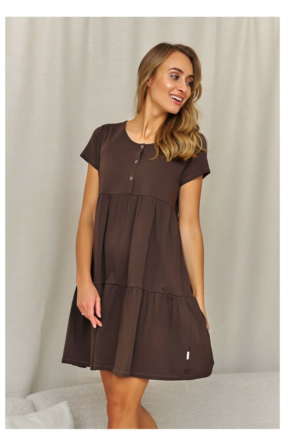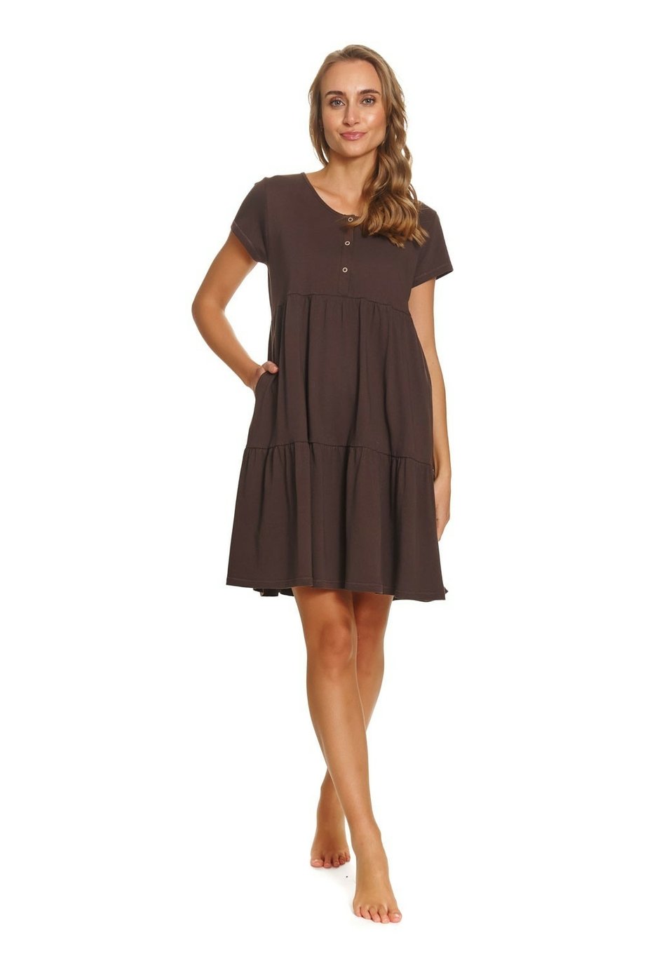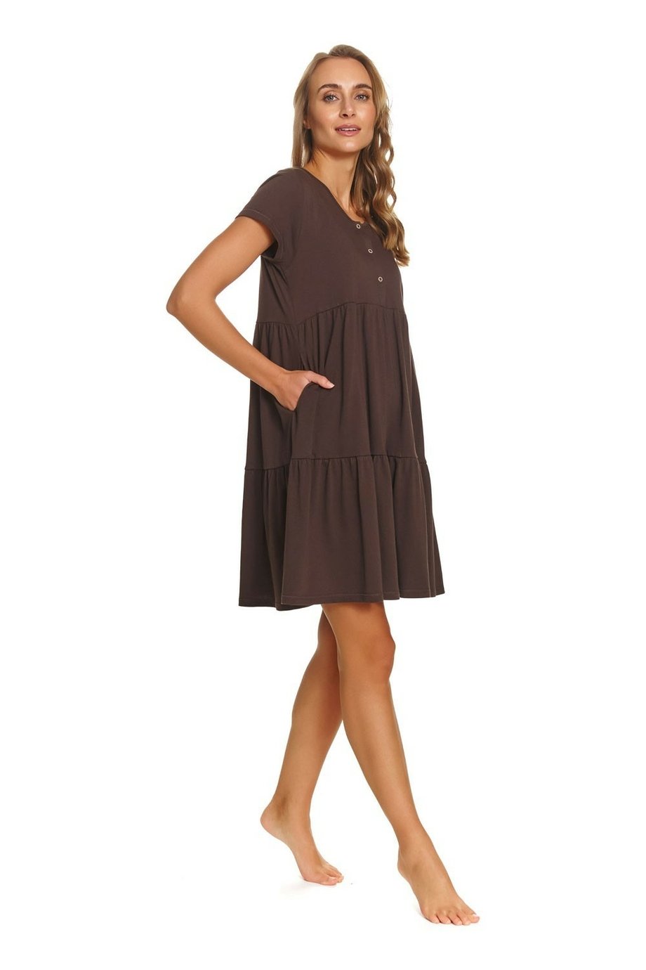 Dámská bavlněná noční košile DOCTOR NAP s krátkým rukávem, rozepínací légou a dvěma kapsami ve švech. Noční košile je po obvodu prostřižená a lehce ve 2 řadách nařasená a je ideální jako těhotenská a mateřská ke kojení.
