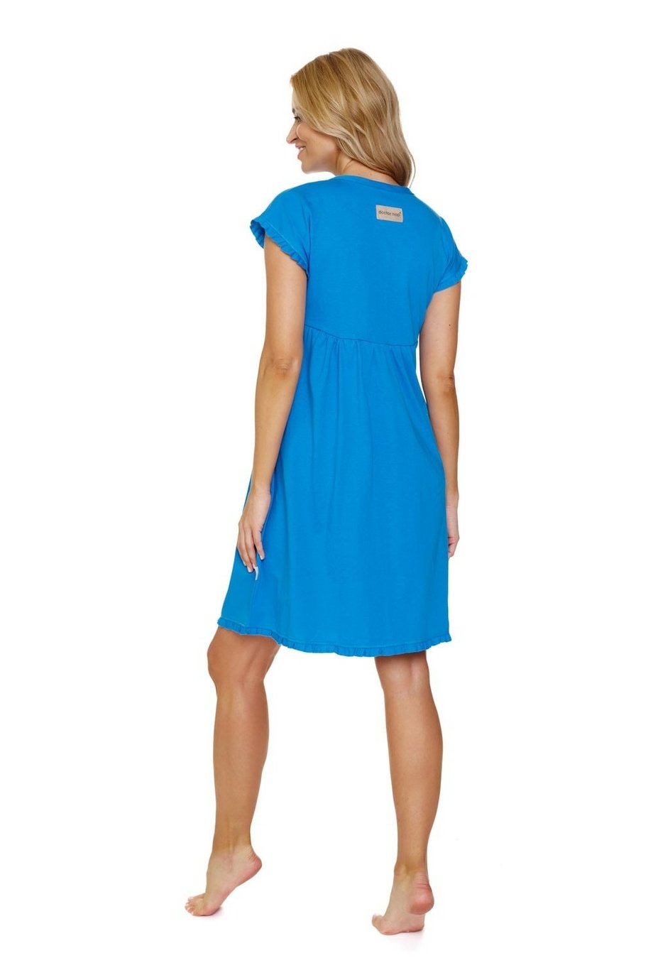 Dámská celorozepínací bavlněná noční košile DOCTOR NAP s krátkým rukávem a dvěma kapsami ve švech v krásné modré barvě. Noční košile je po obvodu prostřižená a lehce nařasená a je ideální jako těhotenská a mateřská ke kojení.