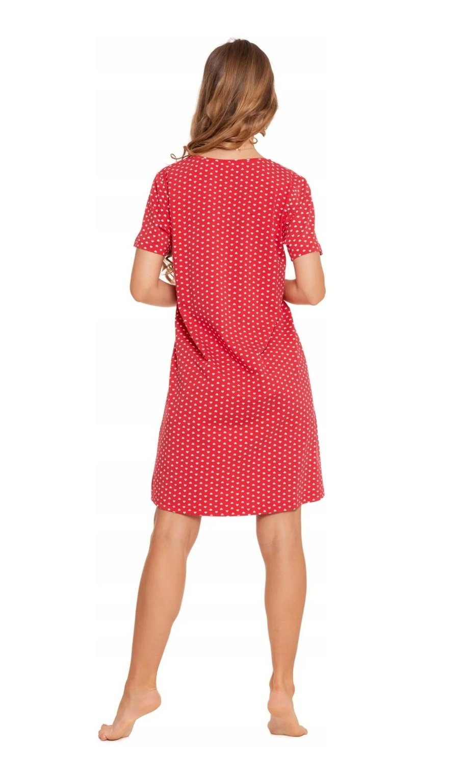 Dámská bavlněná noční košile MORAJ s krátkým rukávem a kulatým výstřihem zdobená tiskem drobných bílých srdíček na červeném základě. Noční košile je v délce ke kolenům.