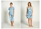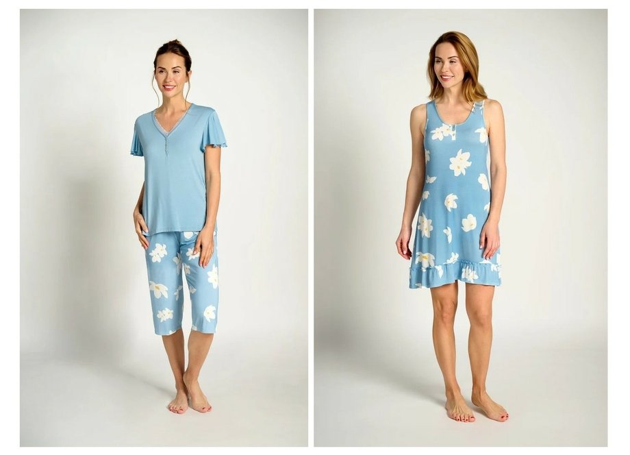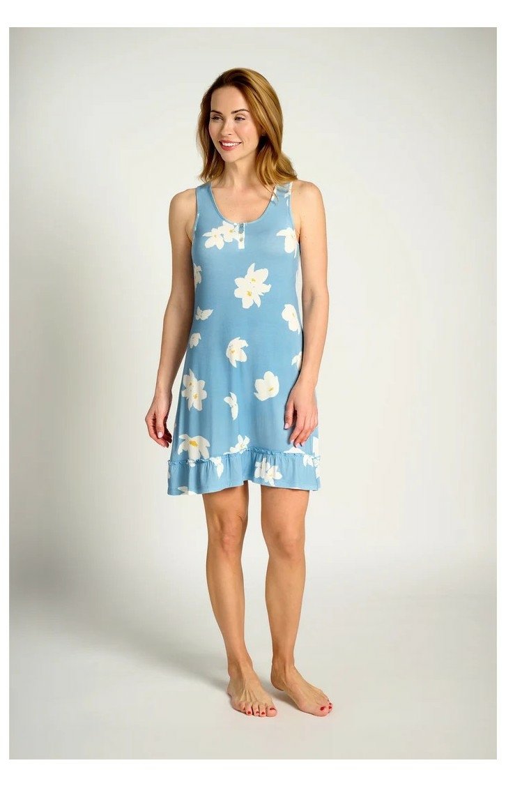 Dámská viskózová noční košile MUYDEMI bez rukávu s tiskem bílých květů na sv.modrém základě. U kulatého výstřihu je rozepínací léga se 3 knoflíčky. Noční košile je ukončena malým volánkem.