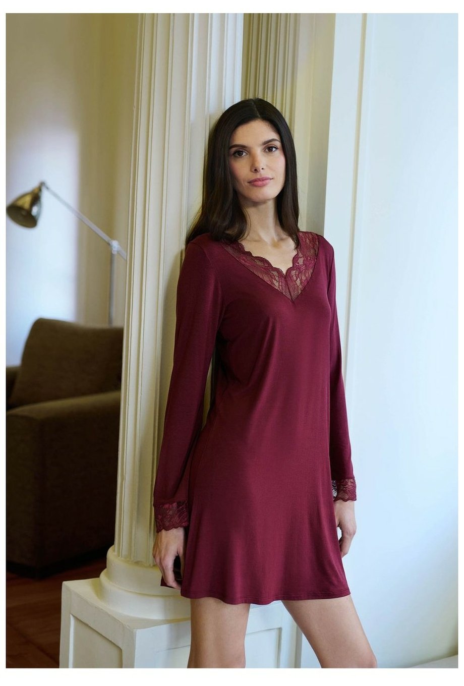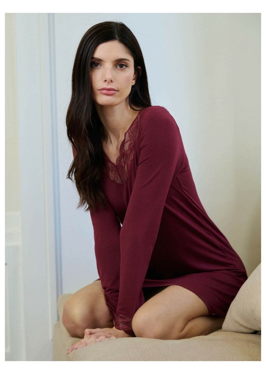 Dámská krátká noční košile VAMP s dlouhým rukávem a výstřihem do V zdobeným jemnou krajkou na předním i zadním díle. Klasický, jednoduchý střih, který spojuje styl a pohodlí.