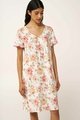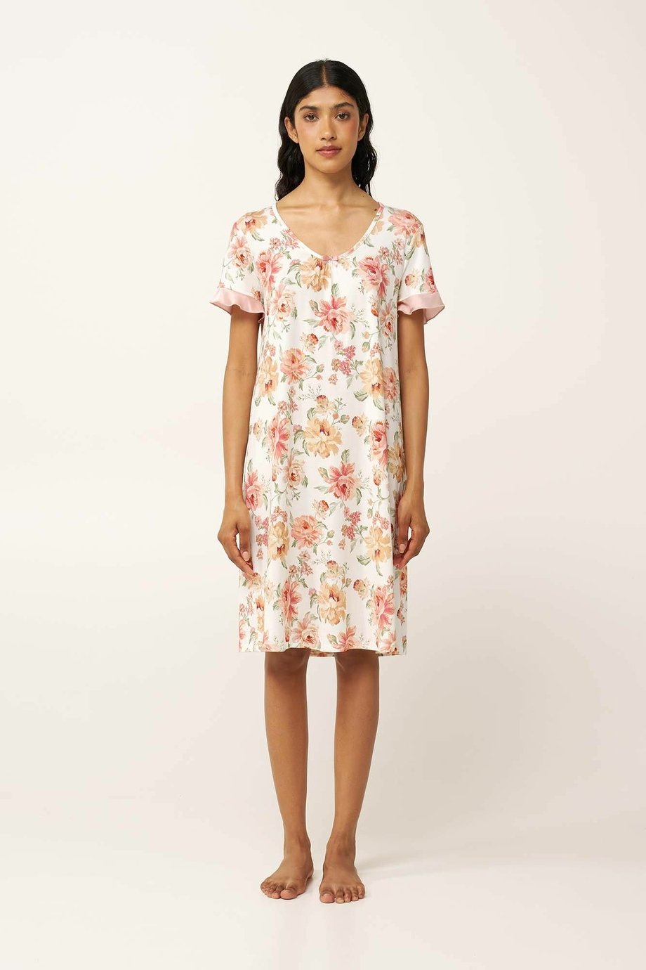 Dámská pohodlná noční košile VAMP volnějšího střihu s krátkým rukávem zdobená tiskem květů v délce ke kolenům. Košile je u výstřihu lehce nařasená a krátké rukávy jsou kontrastně lemovány růžovým saténem.