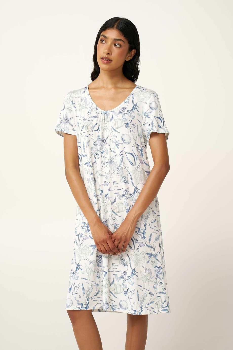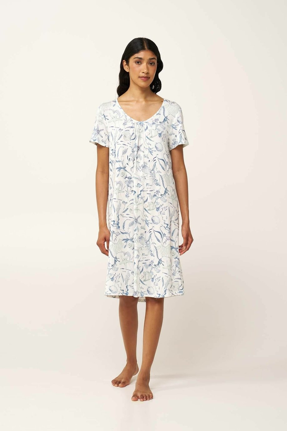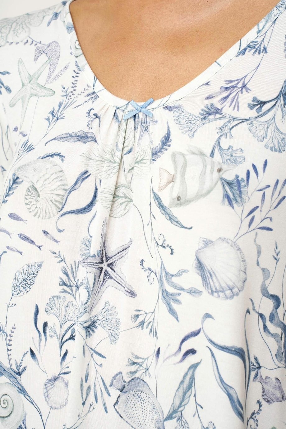 Dámská pohodlná noční košile VAMP volnějšího střihu s krátkým rukávem zdobená tiskem mořského světa v délce ke kolenům. Košile je u výstřihu lehce nařasená.