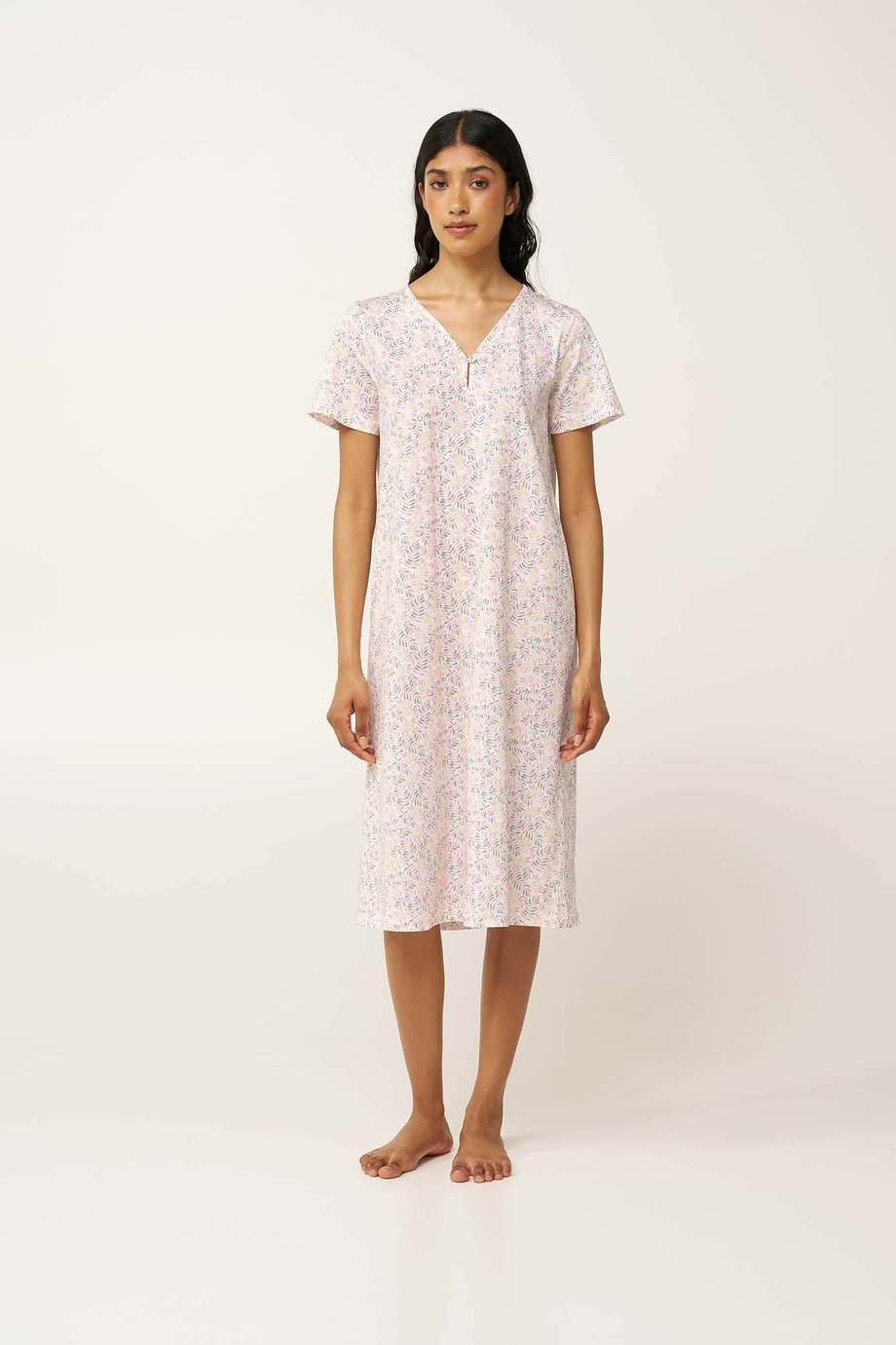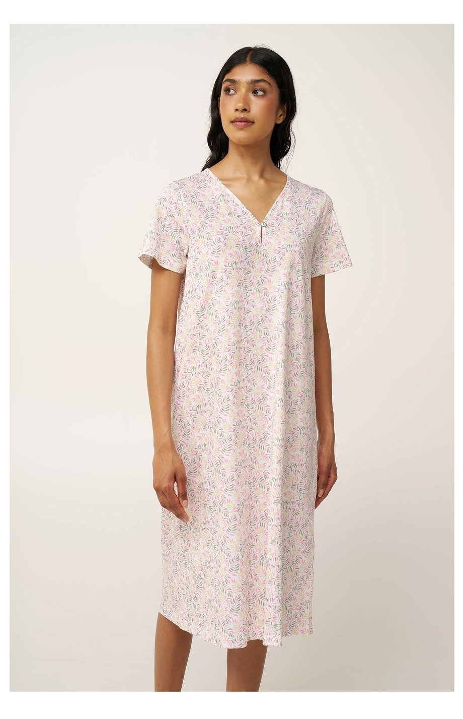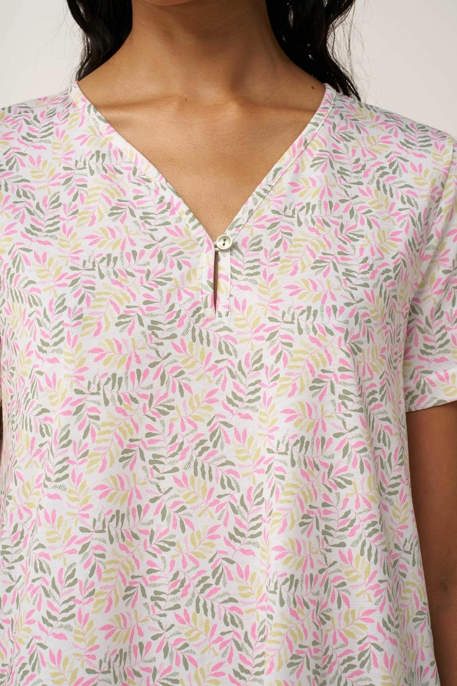 Dámská delší noční košile VAMP s krátkým rukávem a výstřihem do V s jedním knoflíčkem na zapnutí. Košile je zdobená jemným tiskem barevných větviček a je ideální pro odpočinek i pohodlný spánek.