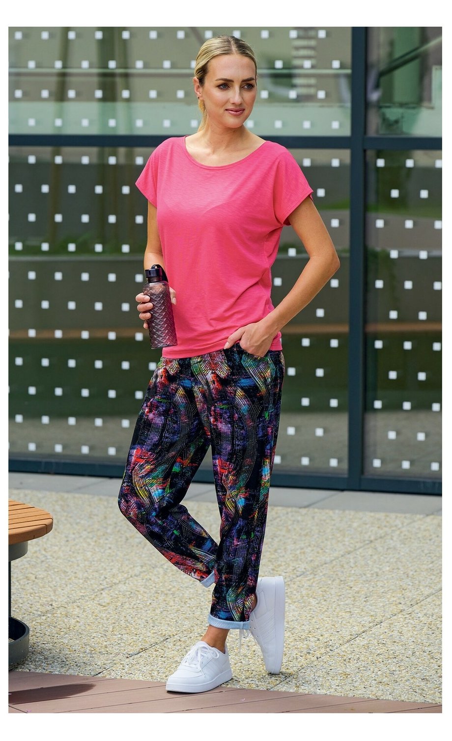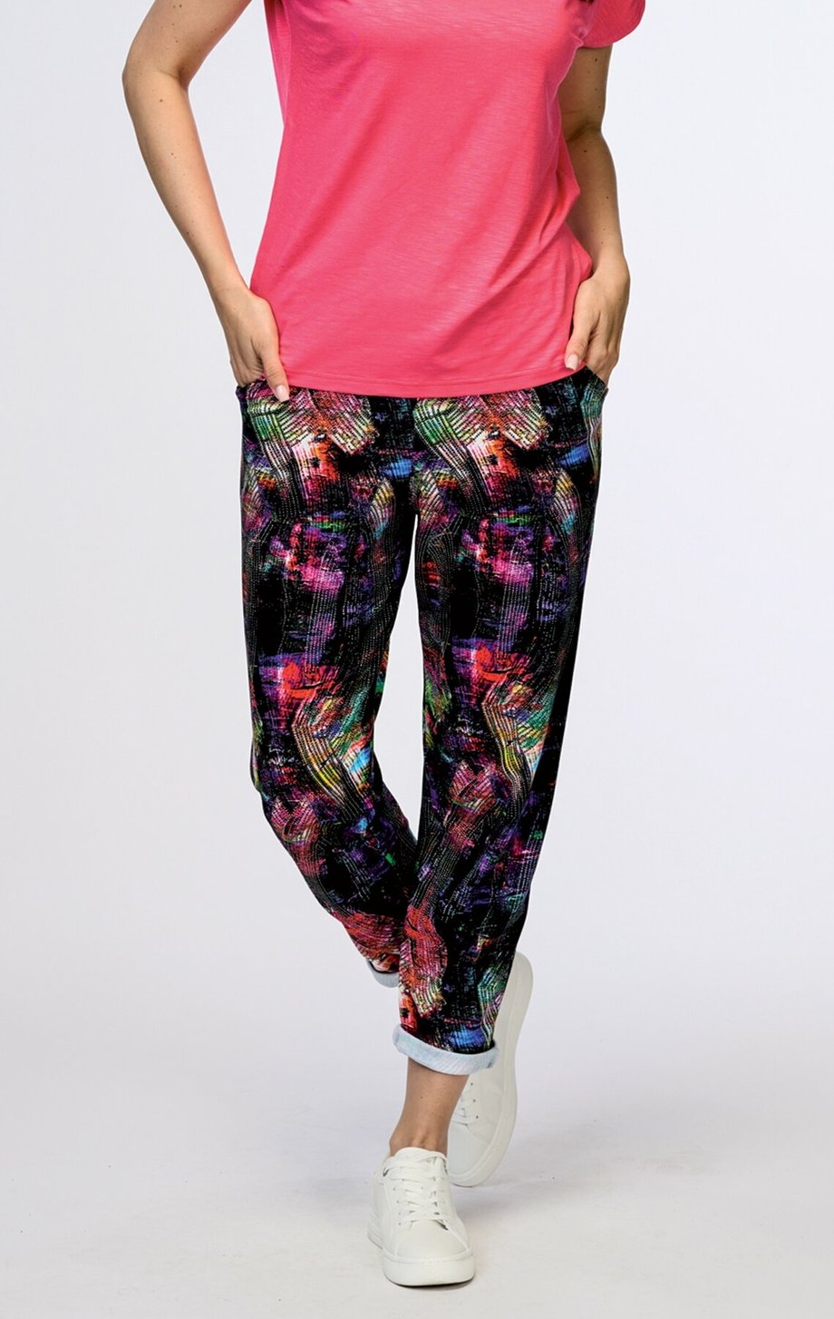Dámské 7/8 kalhoty DRAPS s vyšším sedem a s kapsami s originálním barevným vzorem pro vaše pohodlí doma i na cestách. Nohavice se u spodního lemu zužují a můžete je i lehce ohrnout.