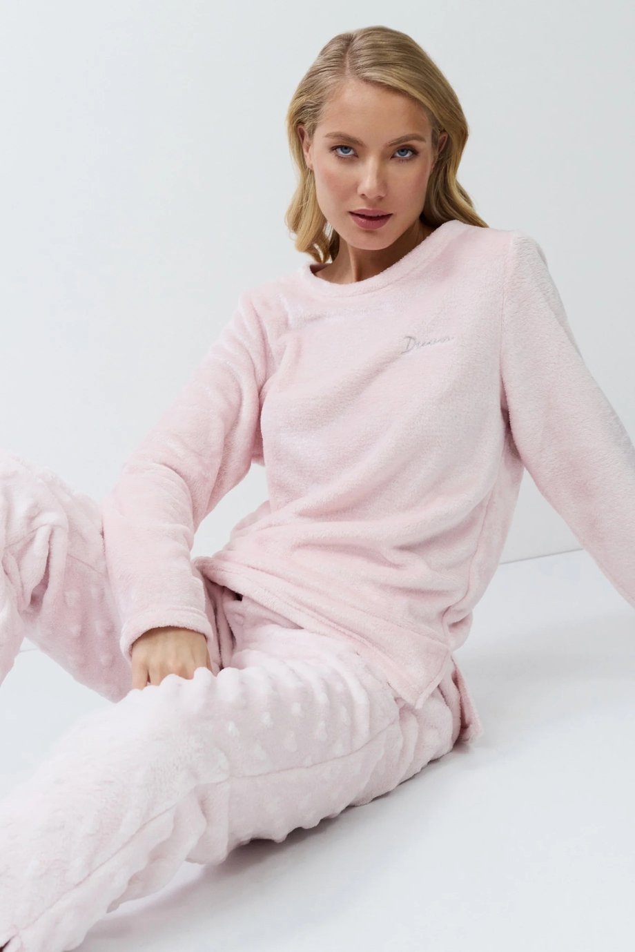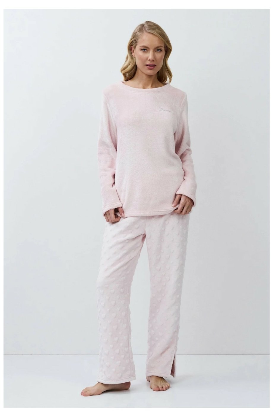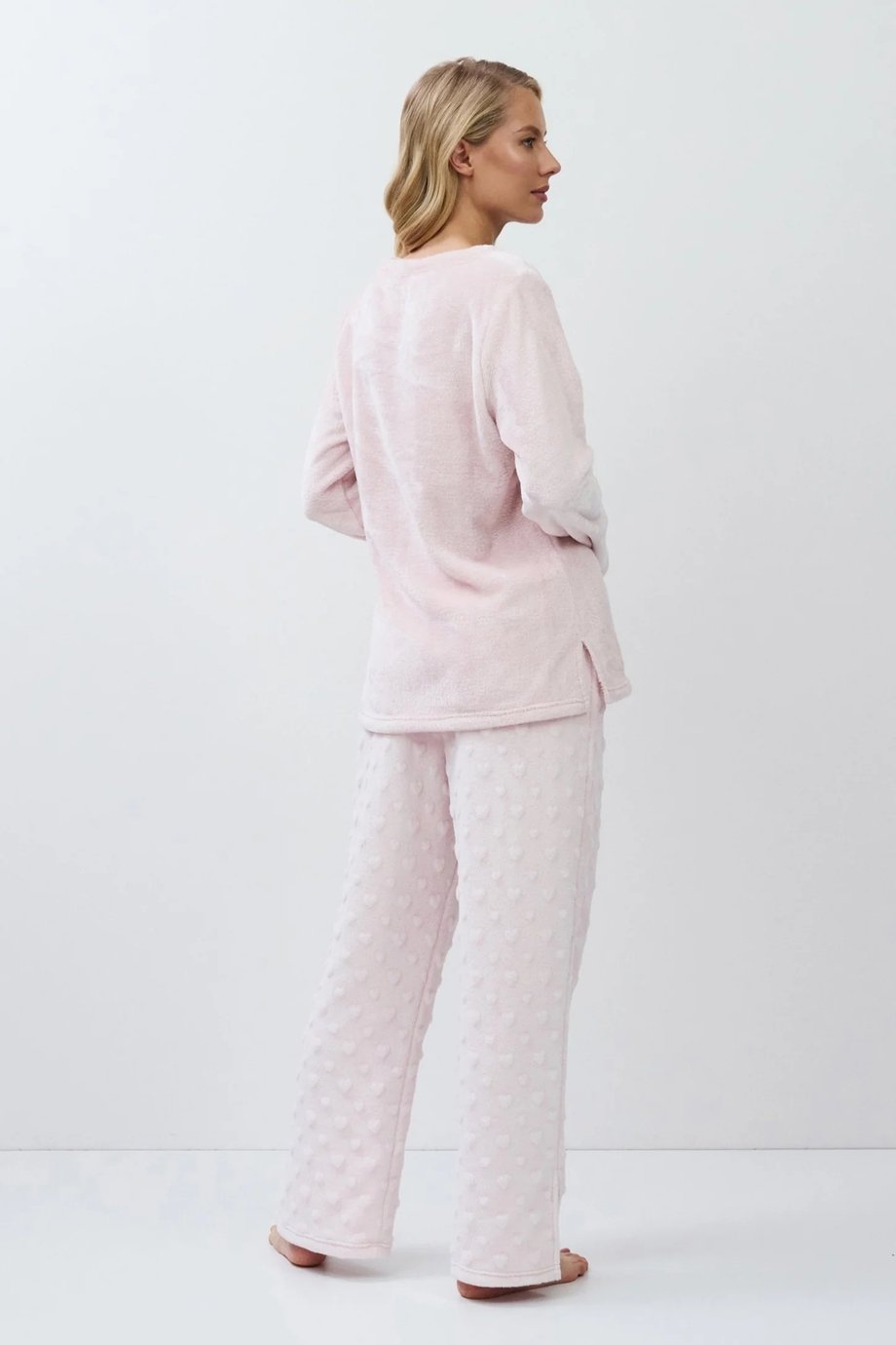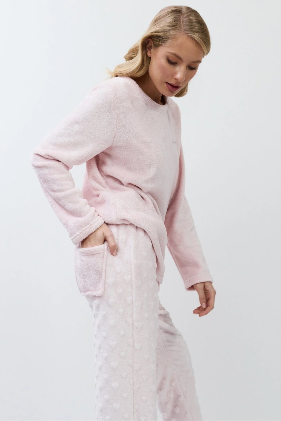 Dámské dlouhé hřejivé pyžamo nebo domácí komplet ARUELLE z mikroplyše pro vaše pohodlí v teple. Na horním díle s kulatým výstřihem je malá výšivka, kalhoty jsou originálně zdobené plastickými 3D srdíčky s kapsou na zadním díle. Nohavice mají efektní malé rozparky.