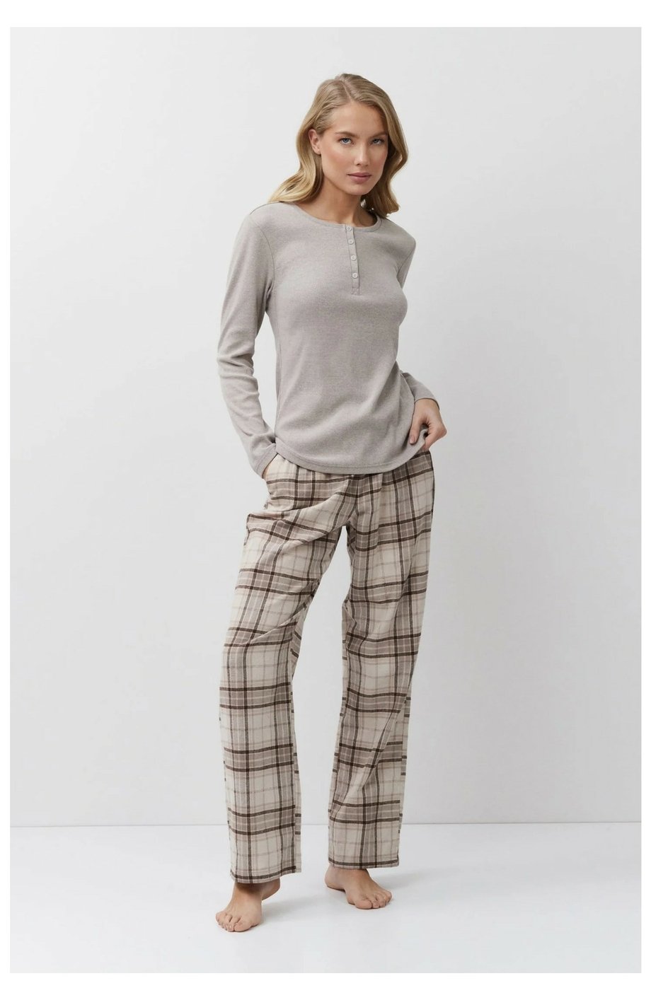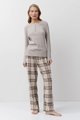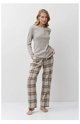 Dámské dlouhé bavlněné pyžamo ARUELLE - Martina je vhodné jak na spaní tak na trávení volného času. Horní jednobarevný díl z žebrovaného elastického materiálu má kulatý výstřih s rozepínací légou na knoflíčky. Kostkované flanelové kalhoty s kapsami jsou v pase do gumy se šňůrkou na stažení.