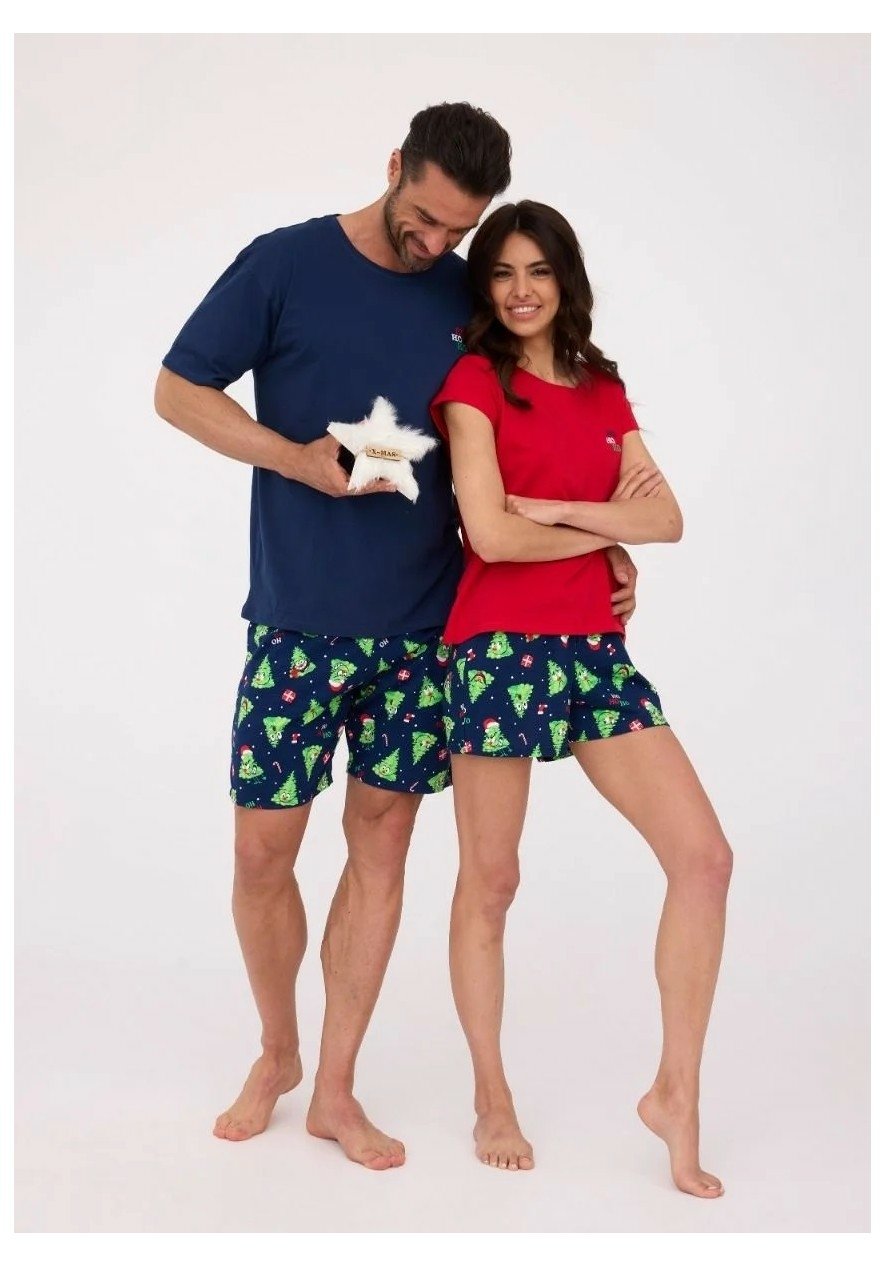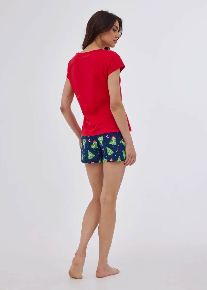 Dámské krátké bavlněné pyžamo CORNETTE - Ho Ho s tiskem veselých stromečků. Kraťasy jsou celotištěné s gumou v pase, bez kapes. Horní jednobarevný díl s kulatým výstřihem je zdobený originální výšivkou.