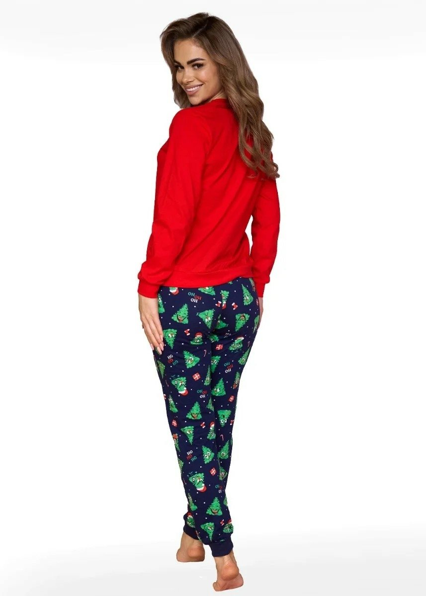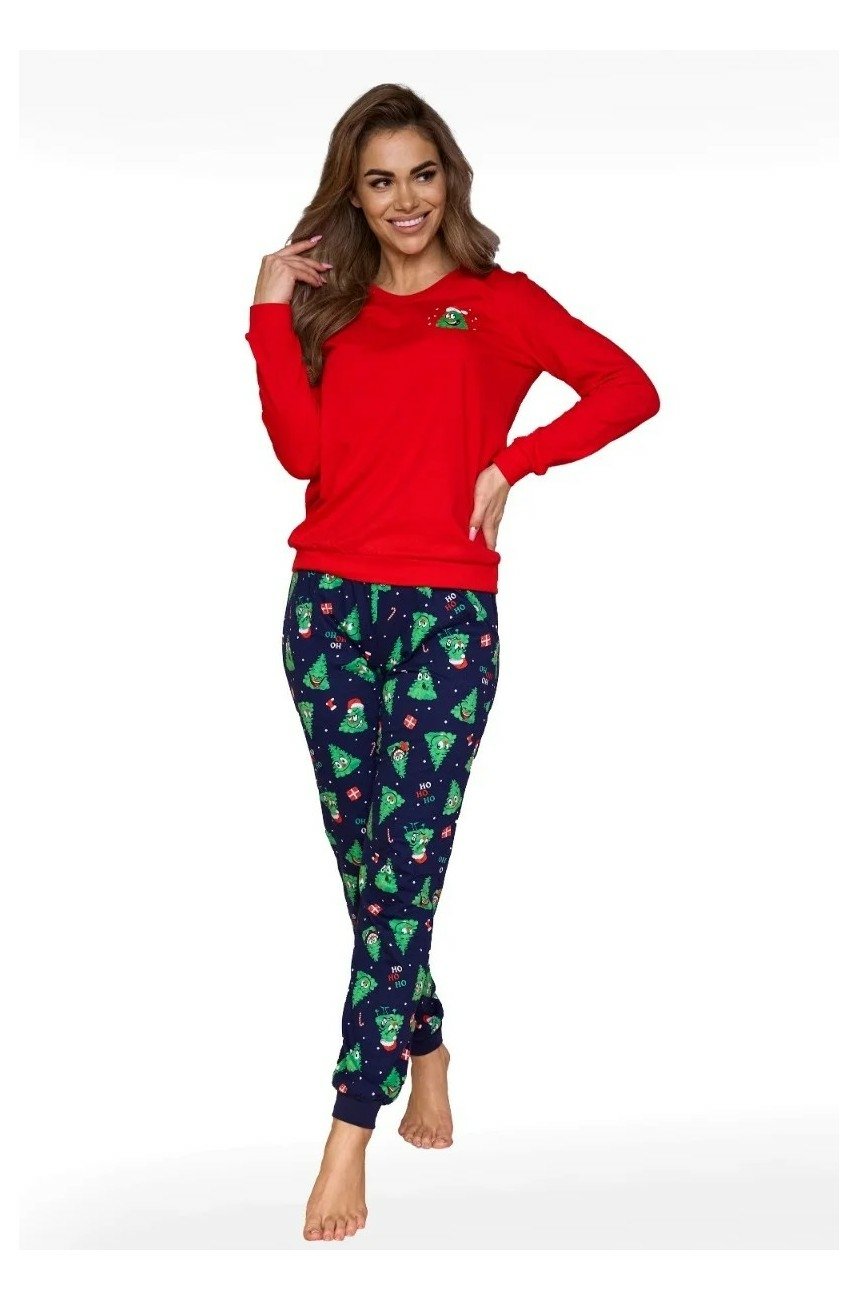 Dámské dlouhé bavlněné pyžamo CORNETTE - Christmas tree s tiskem veselých stromečků. Kalhoty jsou celotištěné s gumou v pase, bez kapes s nohavicemi ukončenými do lemu. Horní jednobarevný díl s kulatým výstřihem je zdobený originálním tiskem s rukávy do lemu.