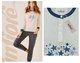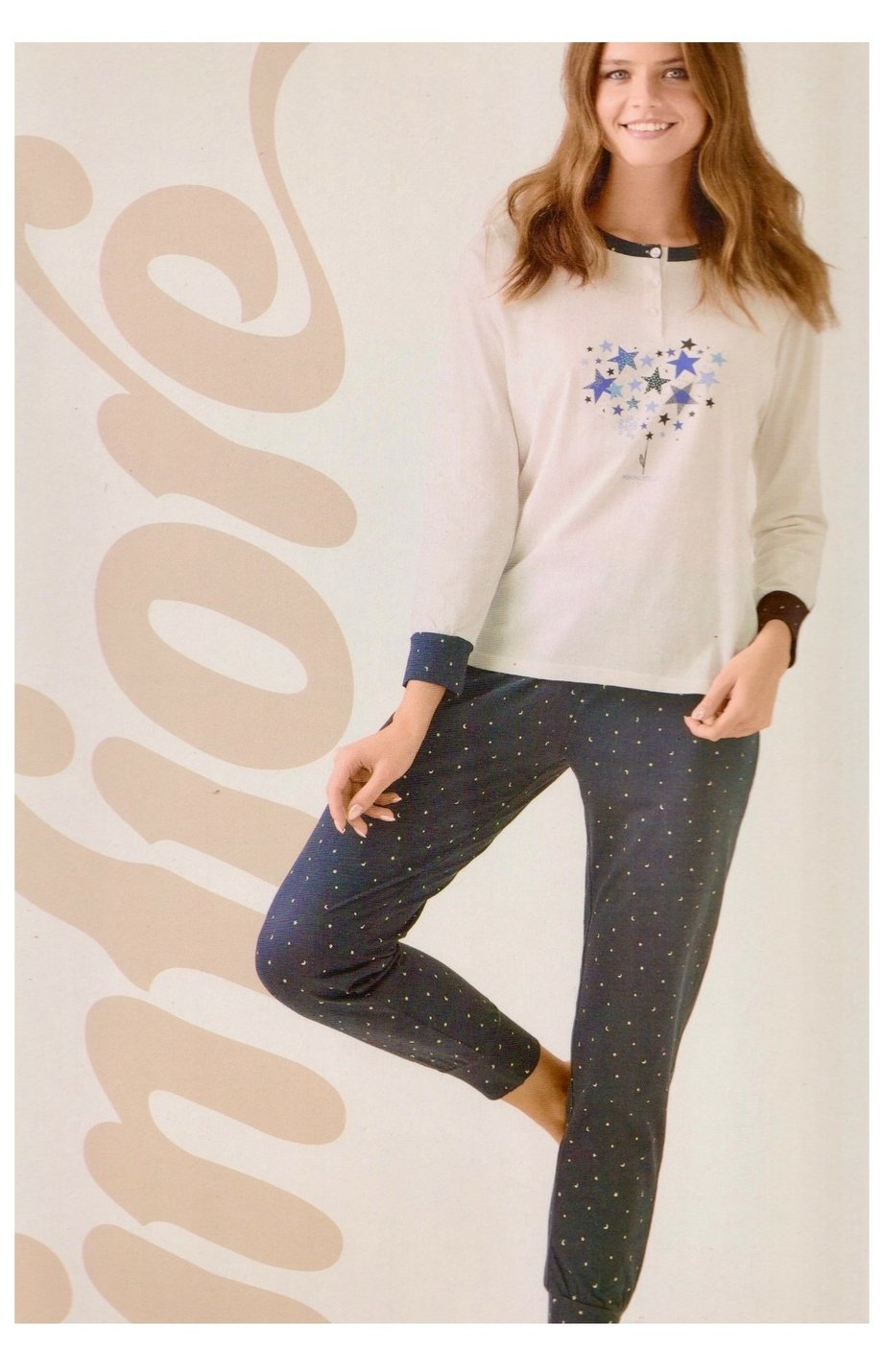 Dámské bavlněné pyžamo INFIORE - Galaxy s dlouhými rukávy a kulatým výstřihem se třemi knoflíčky zdobené na předním díle tiskem drobných hvězdiček se třpytem. Výstřih a rukávy jsou kontrastně lemovány. Celovzorované kalhoty jsou v pase do gumy, nohavice ukončené lemem.
