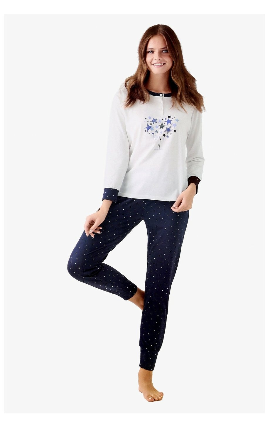 Dámské bavlněné pyžamo INFIORE - Galaxy s dlouhými rukávy a kulatým výstřihem se třemi knoflíčky zdobené na předním díle tiskem drobných hvězdiček se třpytem. Výstřih a rukávy jsou kontrastně lemovány. Celovzorované kalhoty jsou v pase do gumy, nohavice ukončené lemem.
