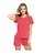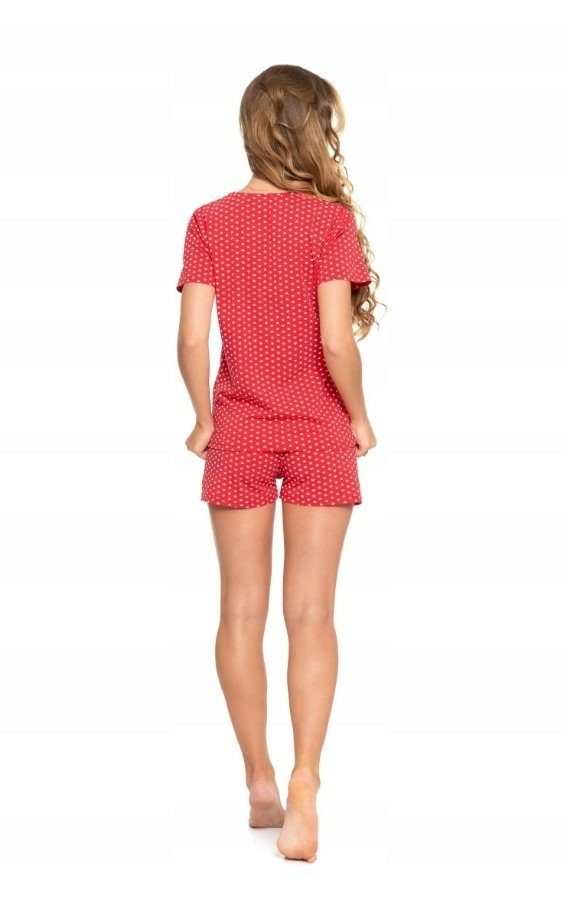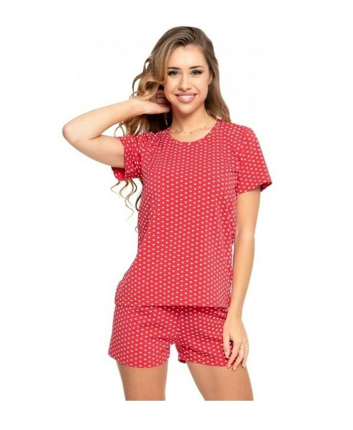 Dámské bavlněné pyžamo MORAJ s krátkým rukávem a kraťasy zdobené tiskem drobných bílých srdíček na červeném základě.