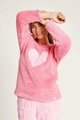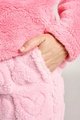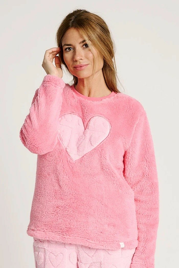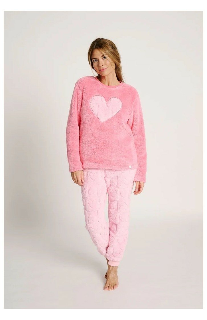 Dámské hřejivé pyžamo nebo domácí komplet MUYDEMI z mikroplyše v růžové barvě se vzorem srdíček s 3D efektem. Kalhoty mají v pase gumu a šňůrku na stažení a nohavice jsou ukončeny do lemu. Horní díl je zdobený kontrastním srdcem.