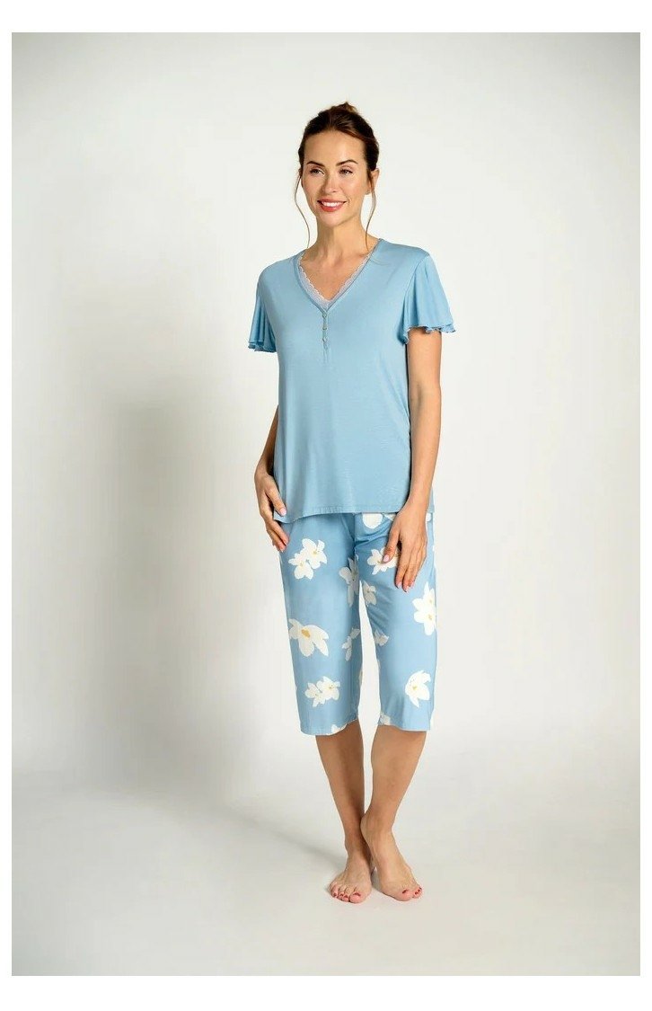 Dámské viskózové pyžamo MUYDEMI s krátkým rukávem a 3/4 nohavicemi se vzorem bílých květů na sv.modrém základě. Vzorované kalhoty mají v pase gumu a šňůrku na stažení. Horní díl je jednobarevný s výstřihem lemovaným jemnou krajkou.