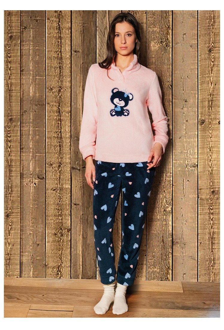 Dámské hřejivé pyžamo nebo domácí komplet SIELEI z mikroplyše. Kalhoty se vzorem srdíček mají v pase gumu a nohavice ukončené do lemu. Horní díl je se stojáčkem a légou se 2 knoflíčky zdobený kontrastním medvídkem.