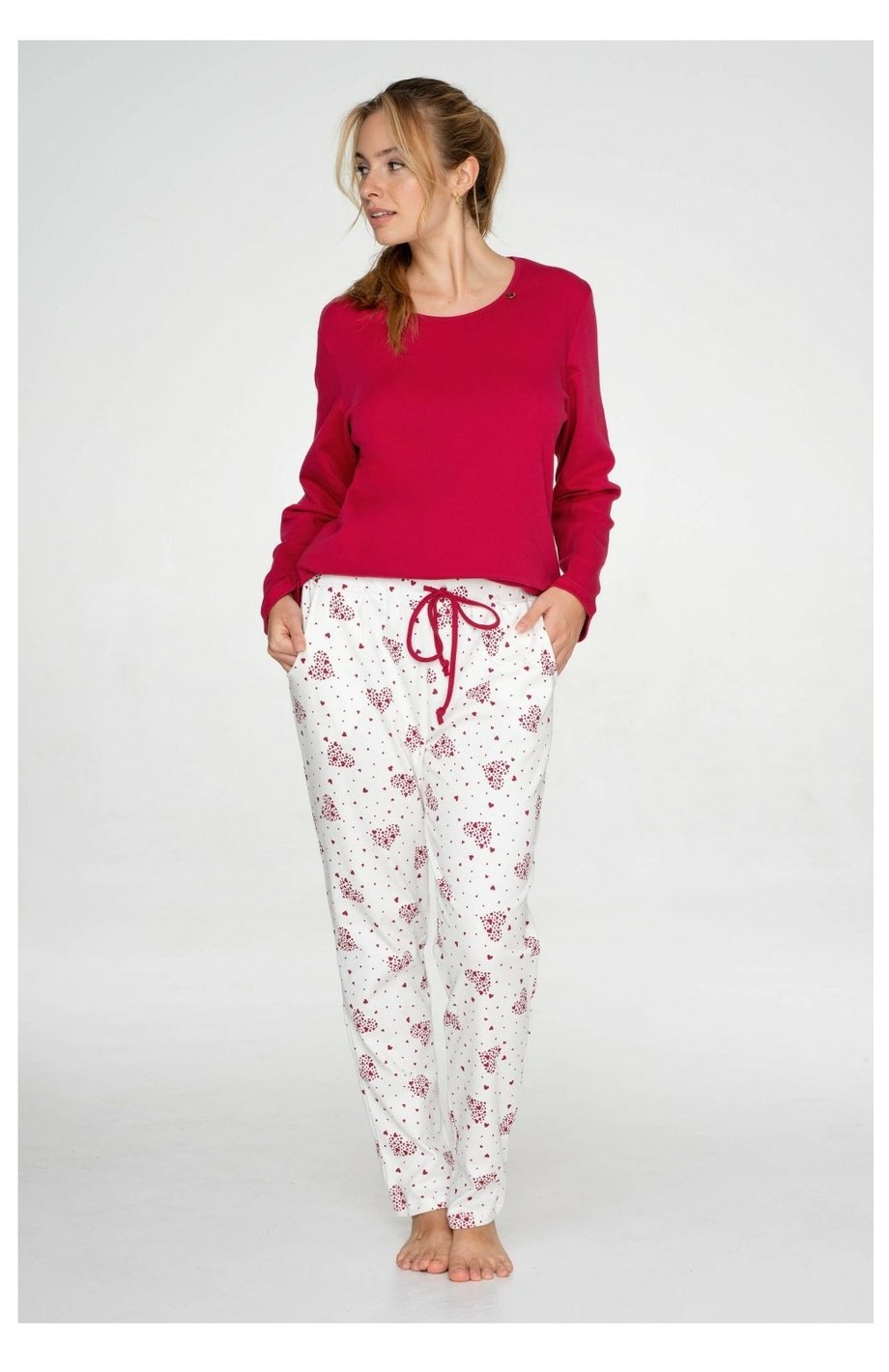 Dámské dlouhé bavlněné pyžamo TIMO - Burgundy hearts s kulatým výstřihem. Kalhoty jsou celotištěné malými srdíčky na bílém základě a v pase mají gumu a šňůrku na stažení a dvě kapsy. Pyžamo je ideální pro klidný spánek nebo pohodové večery doma.