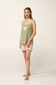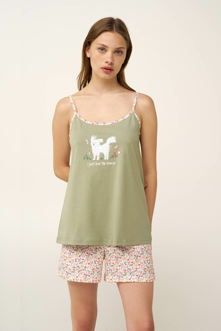 Dámské bavlněné pyžamo VAMP bez rukávu, na tenká kontrastní stavitelná ramínka s kraťasy. Horní díl je jednobarevný s hravým potiskem pejska na prsou a kraťasy jsou vzorované tiskem drobných kytiček a motýlů. Pyžamo je vyrobené z vysoce kvalitní řecké bavlny, která poskytuje vysoké pohodlí a příjemný pocit na dotek. Je ideální pro lenošení doma, odpočinek během dne nebo klidné letní večery.