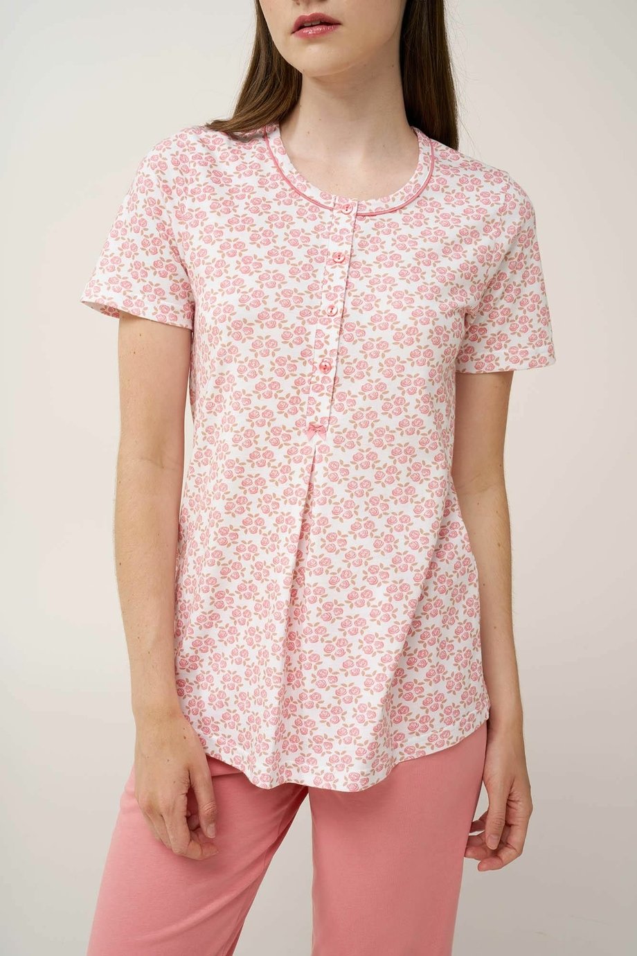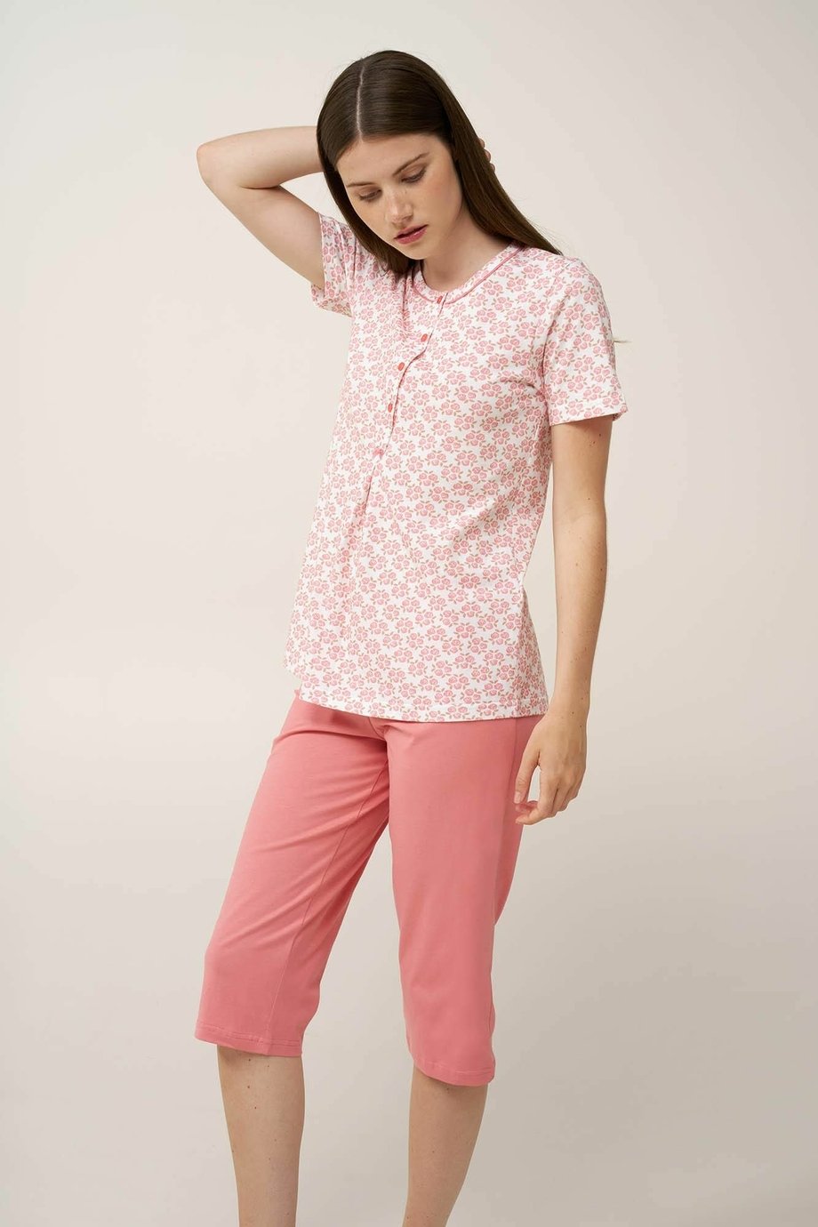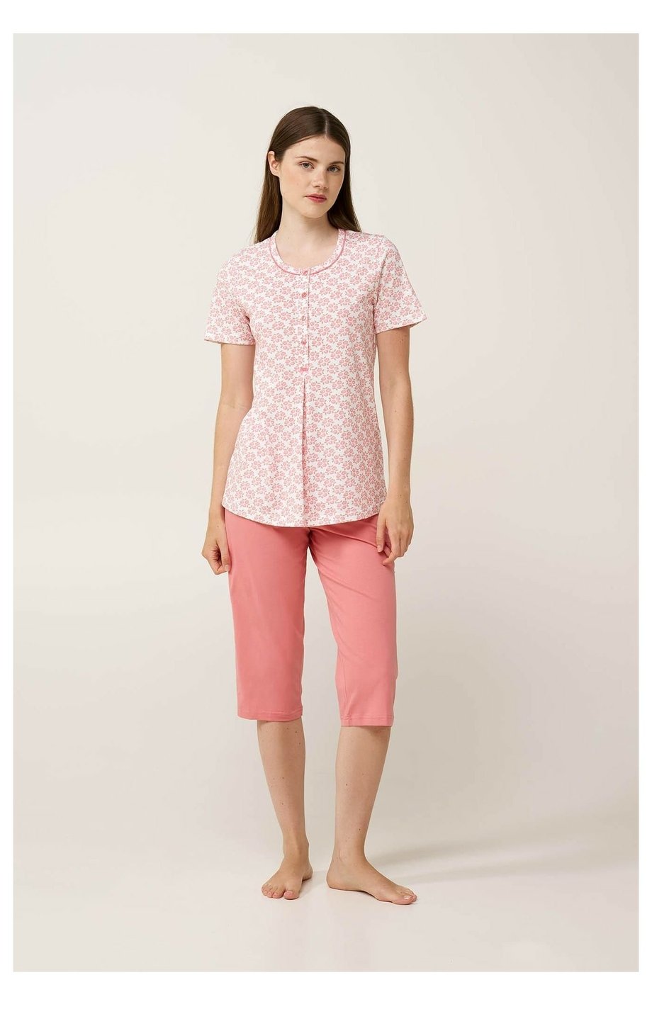 Dámské bavlněné pyžamo VAMP s kulatým výstřihem s rozepínací légou se 4 knoflíčky, krátkým rukávem a 3/4 nohavicí. Horní díl je zdobený originálním tiskem růžových poupat a kalhoty jsou jednobarevné. Pyžamo je vyrobené z vysoce kvalitní řecké bavlny, která poskytuje pohodlí a příjemný pocit na dotek a je ideální na spaní nebo volný čas.