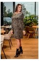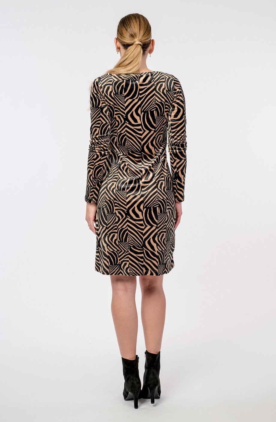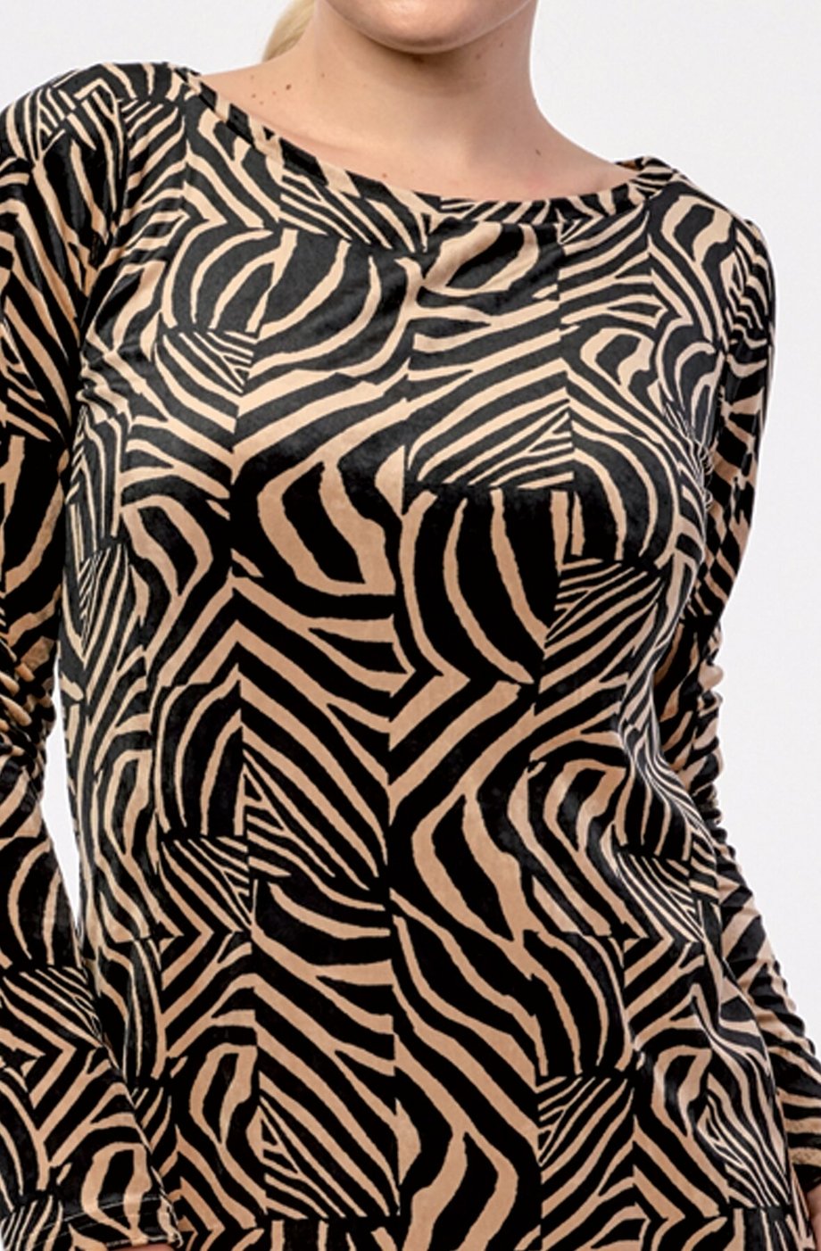 Dámské šaty DRAPS s dlouhým rukávem, lodičkovým výstřihem a délkou nad kolena se sametovým vzhledem.