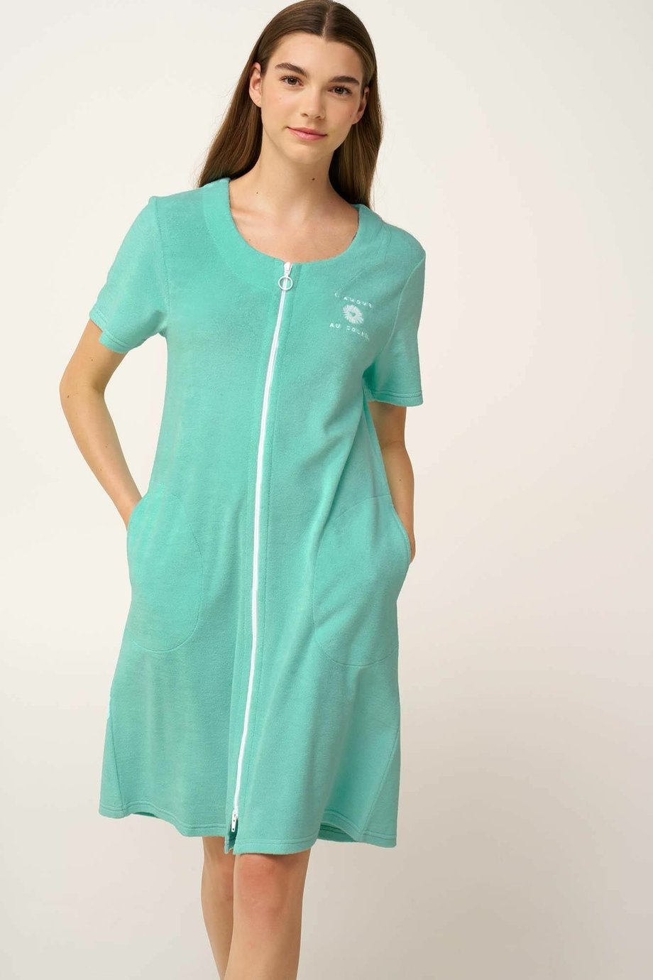 Dámské pohodlné froté celorozepínací plážové šaty VAMP s krátkým rukávem a kapsami v délce nad kolena, které vám poslouží i jako bavlněný krátký župan. Šaty jsou na předním díle zdobené malou výšivkou.