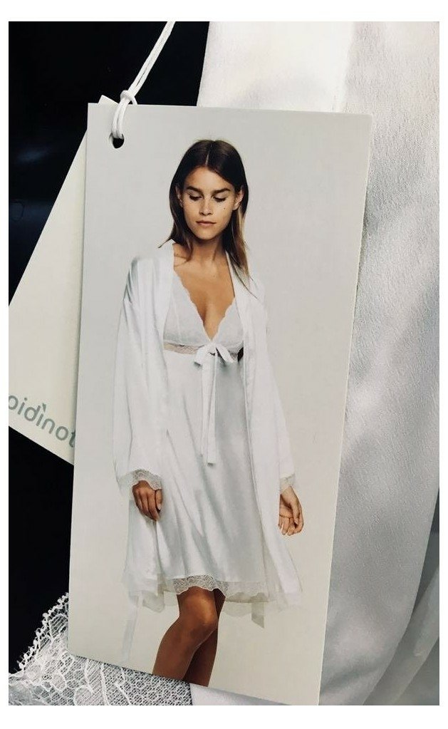Dámský saténový komplet NOIDINOTTE složený z lehkého župánku a noční košilky, zdobený jemnou krajkou.