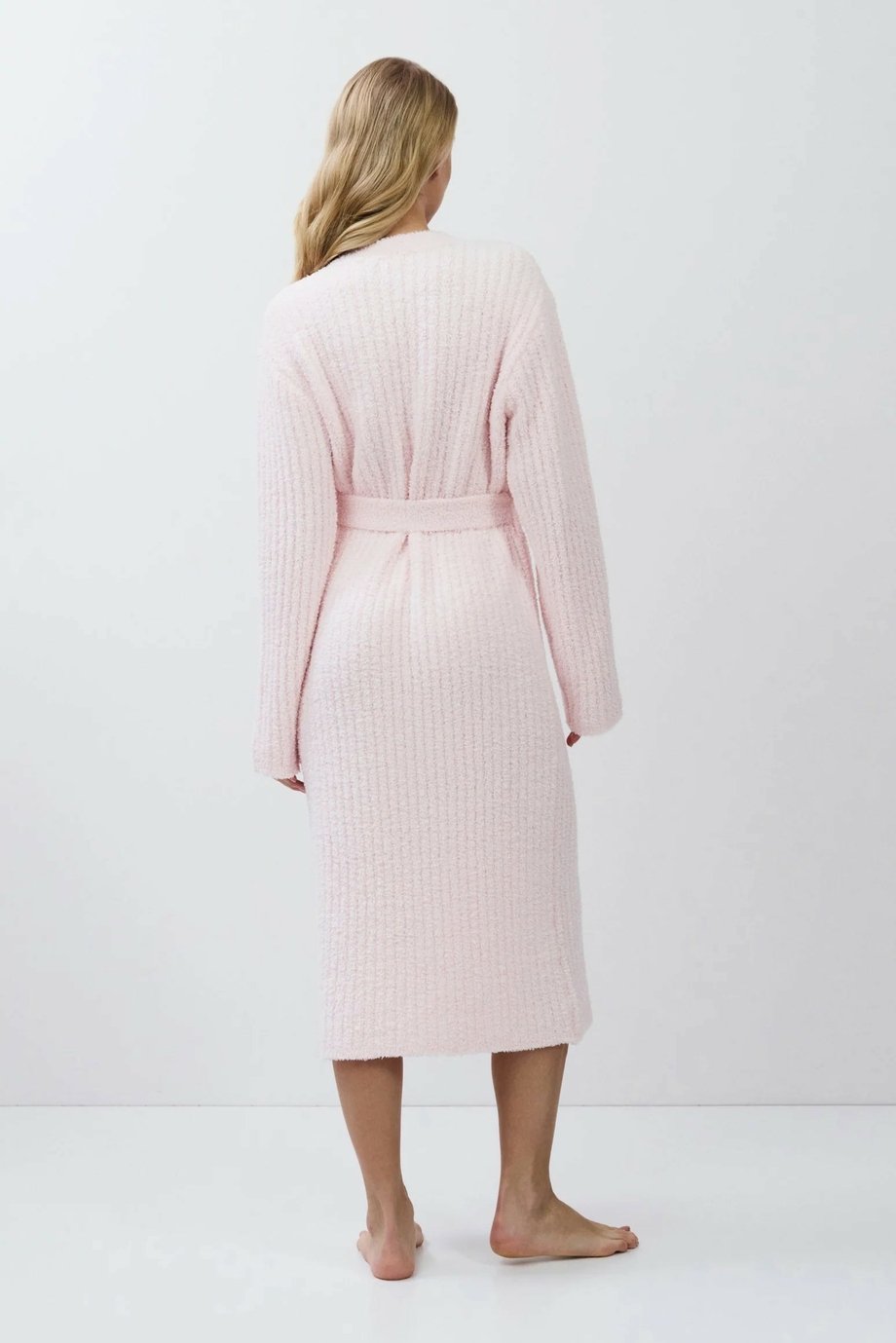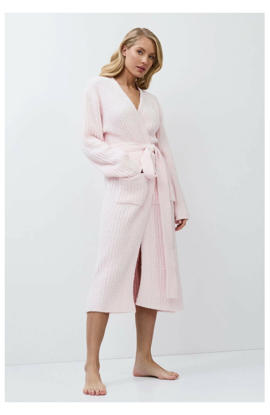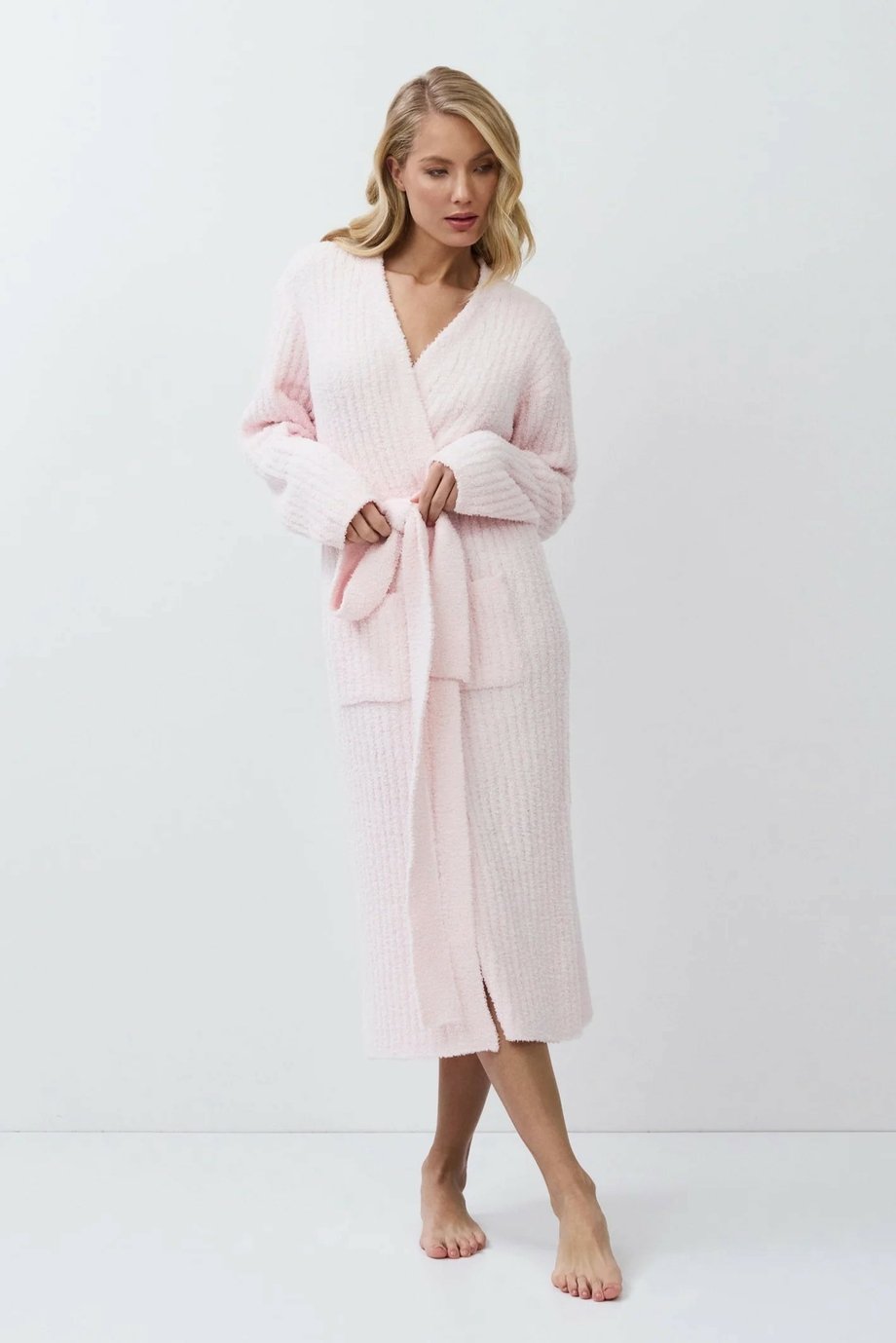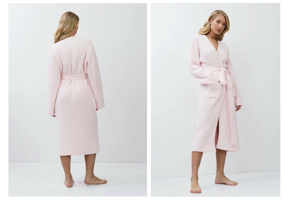 Dámský dlouhý hřejivý župan ARUELLE bez límce s vázačkou a kapsami z žebrované pleteniny pro vaše domácí pohodlí v teple.