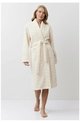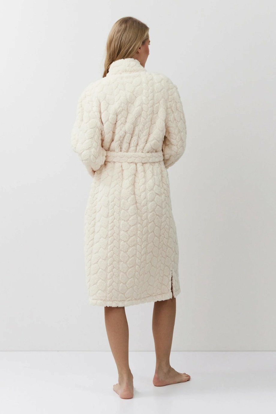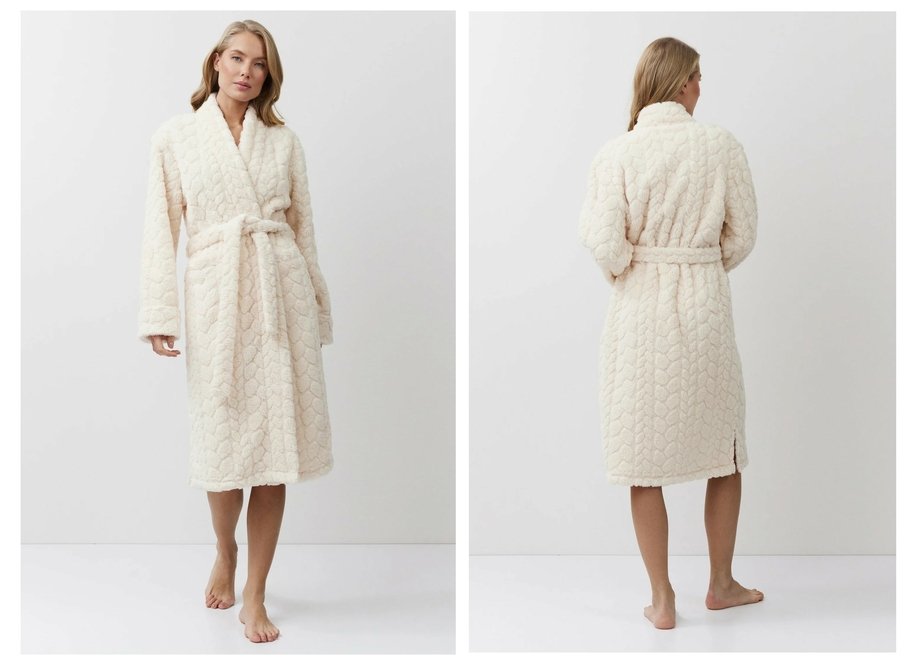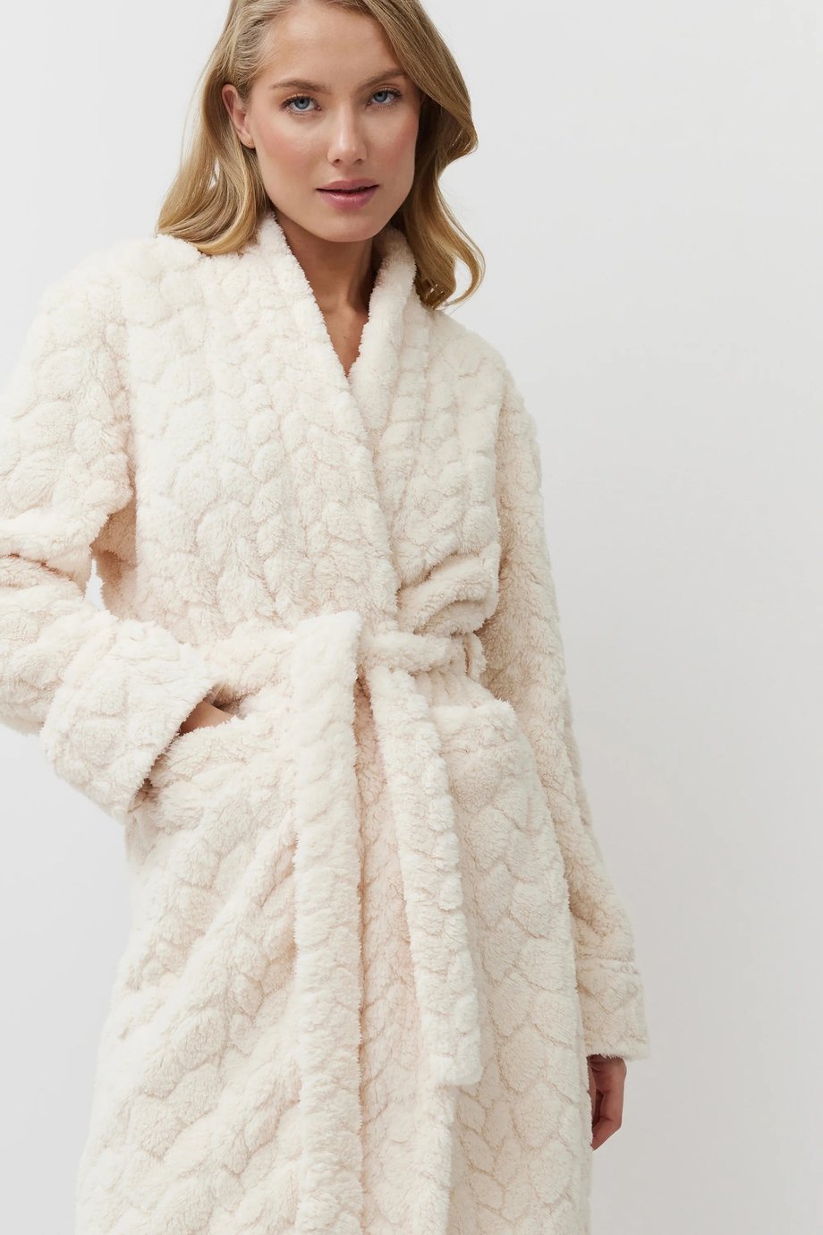 Dámský hřejivý župan ARUELLE - Kristen bez límce z mikroplyše s vázačkou a kapsami na předním díle s plastickým vzorem pro vaše pohodlí.