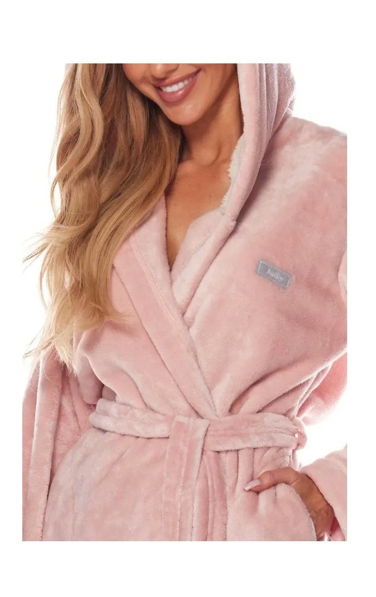 Dámský dlouhý hřejivý župan L&L s vázačkou, kapsami a kapucí zdobenou umělou bílou kožešinkou.