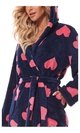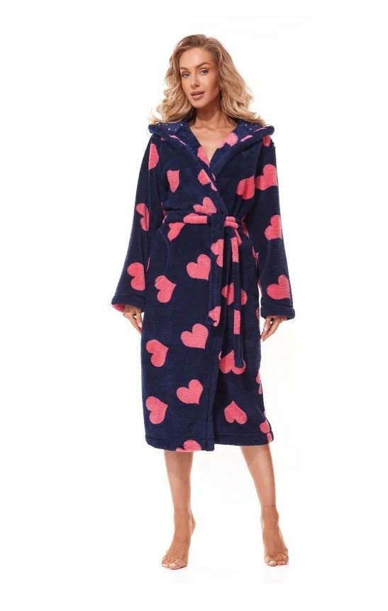 Dámský dlouhý hřejivý župan L&L - Futura s kapucí, kapsami a vázačkou zdobený tiskem růžových srdíček na tm.modrém základě.