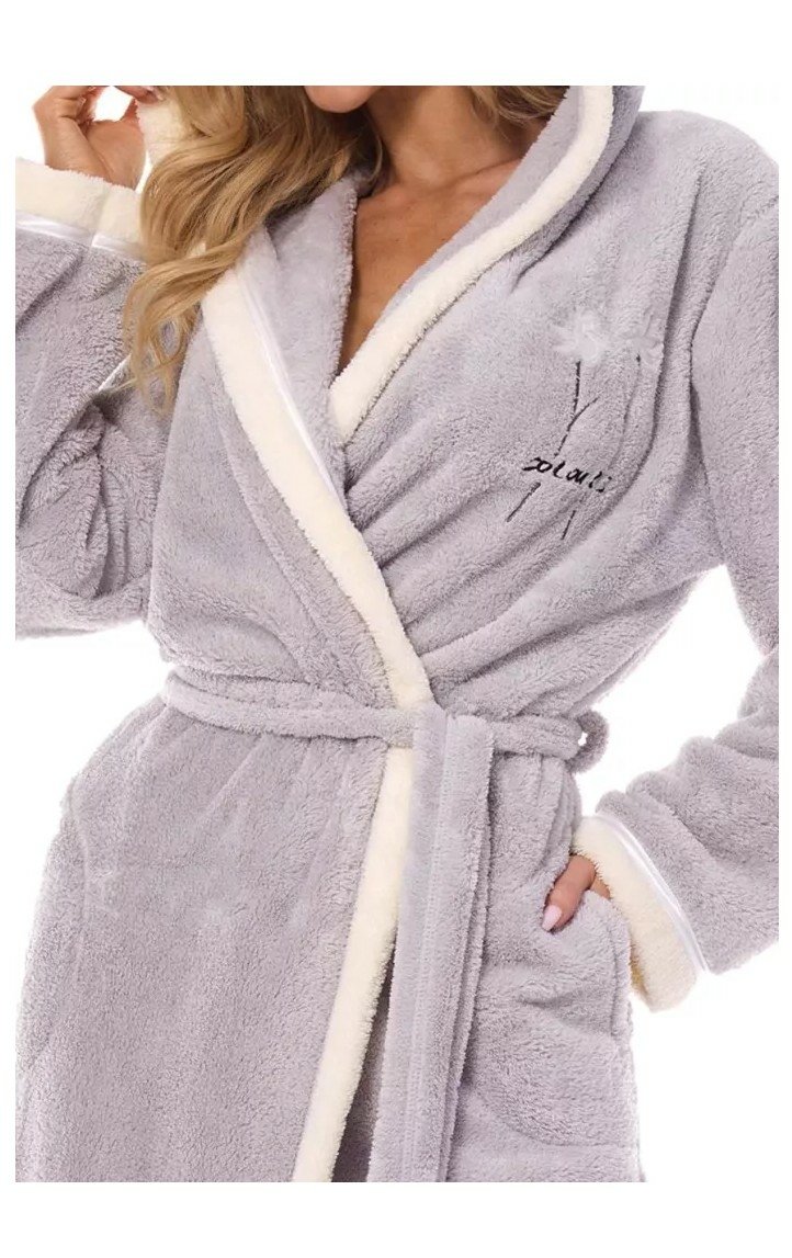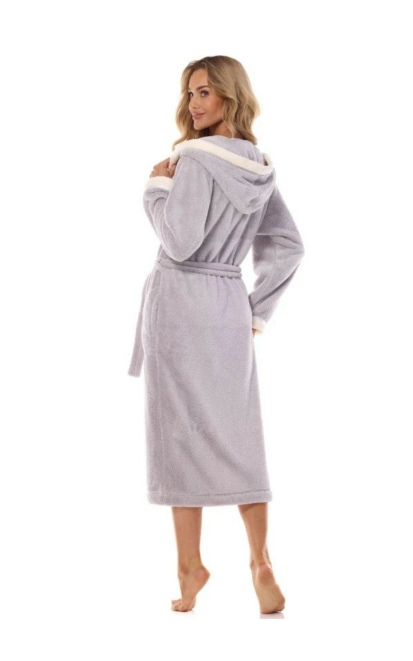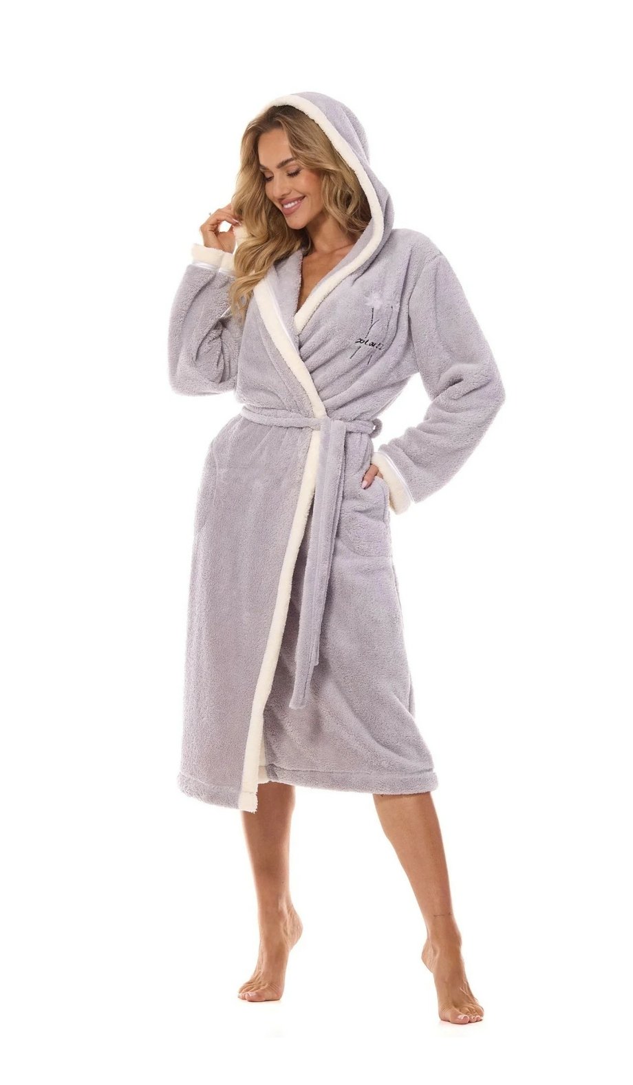 Dámský dlouhý hřejivý župan L&L - Tess s kapucí, kapsami, vázačkou a malou výšivkou na předním díle. Župan je kontrastně lemován.