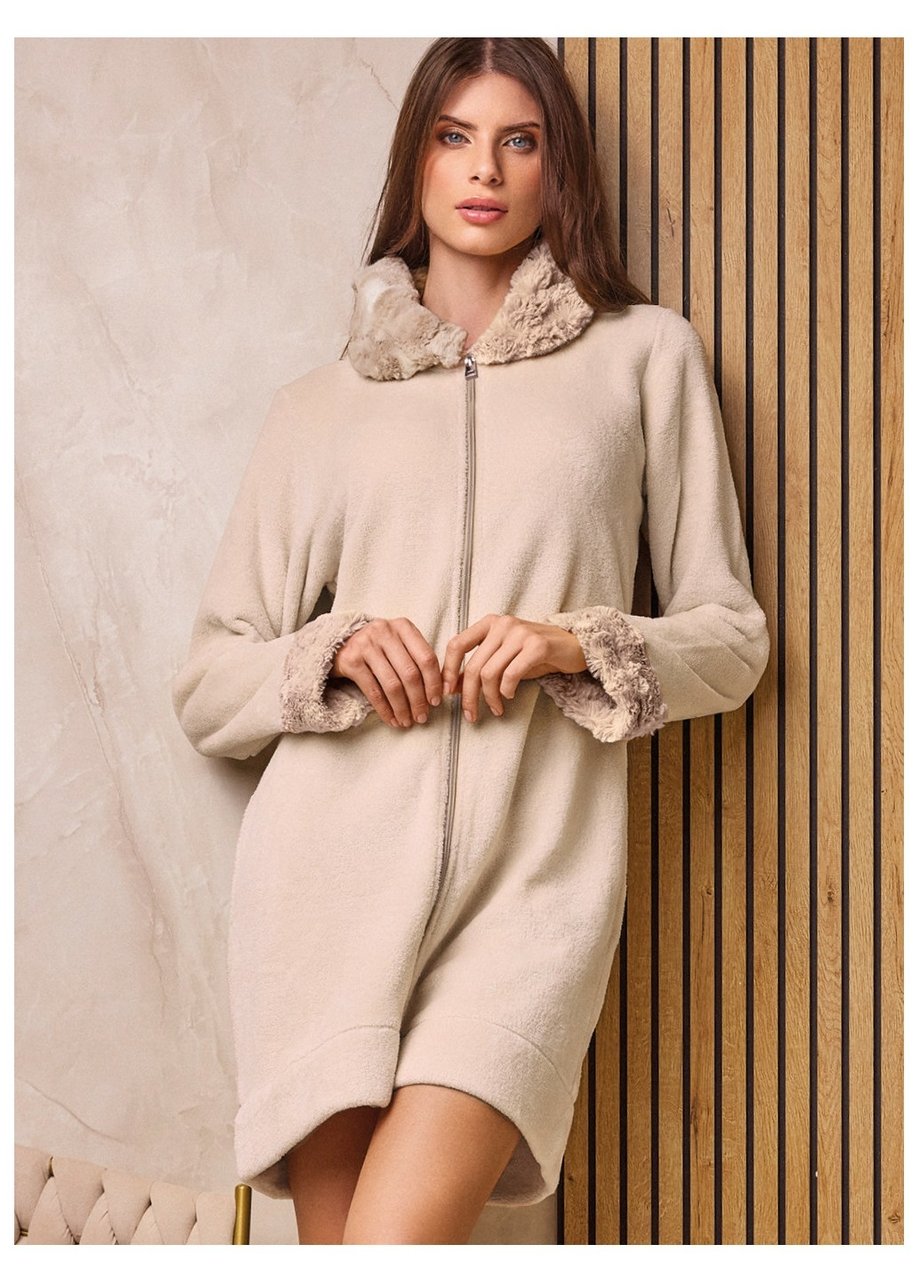Dámský krátký hřejivý celorozepínací župan LORMAR - Angora na zip s límečkem z mikroplyše pro vaše domácí pohodlí. Límec a lemy rukávů jsou z kontrastního plyše.