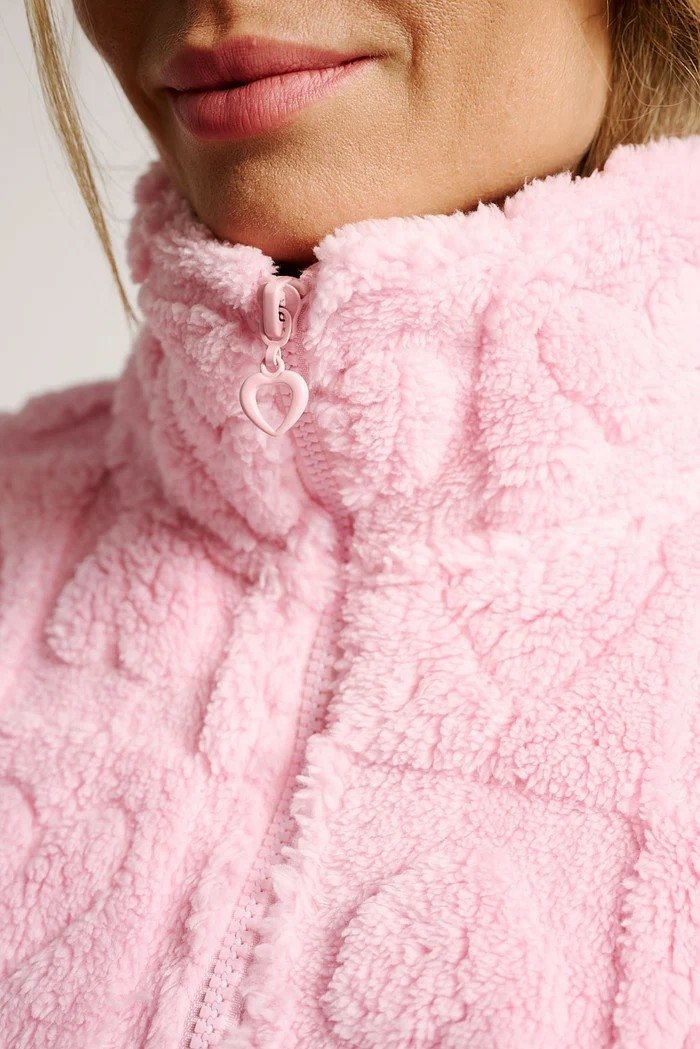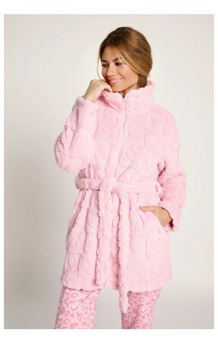 Dámský krátký celorozepínací župan MUYDEMI se zipem, stojáčkem, vázačkou a dvěma kapsami v délce nad kolena z hřejivého mikroplyše pro vaše pohodlí doma nebo na cestách. Župan je zdobený vzorem srdíček s 3D efektem.