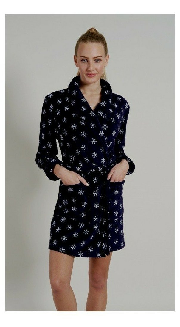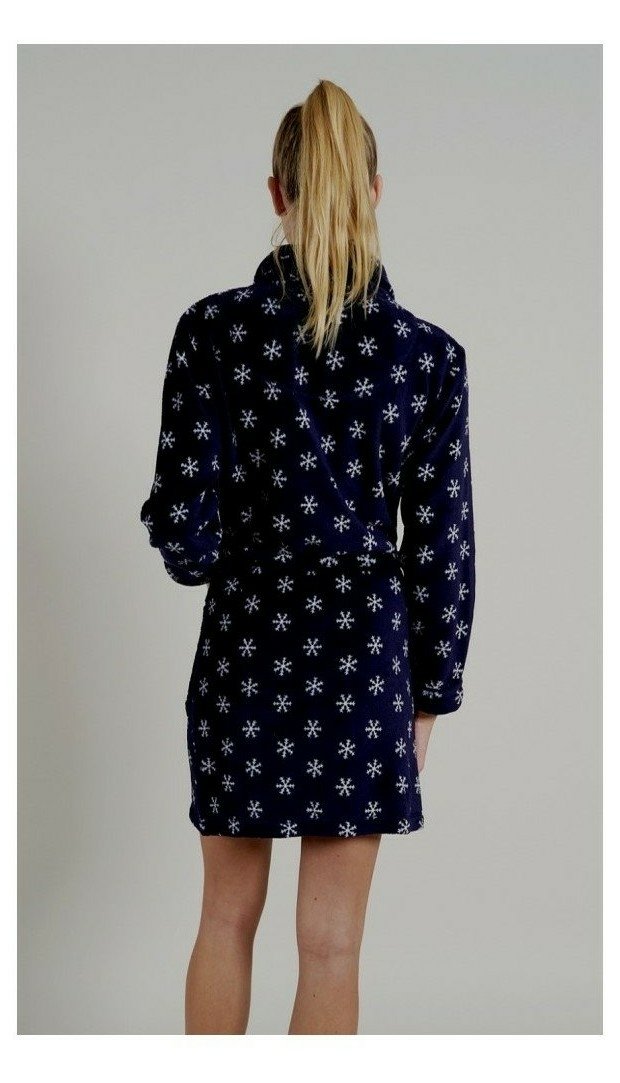 Dámský krátký hřejivý župan TOM TAILOR se šálovým límcem, s vázačkou a dvěma našitými kapsami se vzorem bílých hvězdiček.