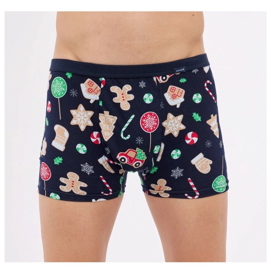Pánské bavlněné boxerky CORNETTE - Candy s vánočním tiskem na tm.modrém základě, v pase ukončené do obšívané gumy.