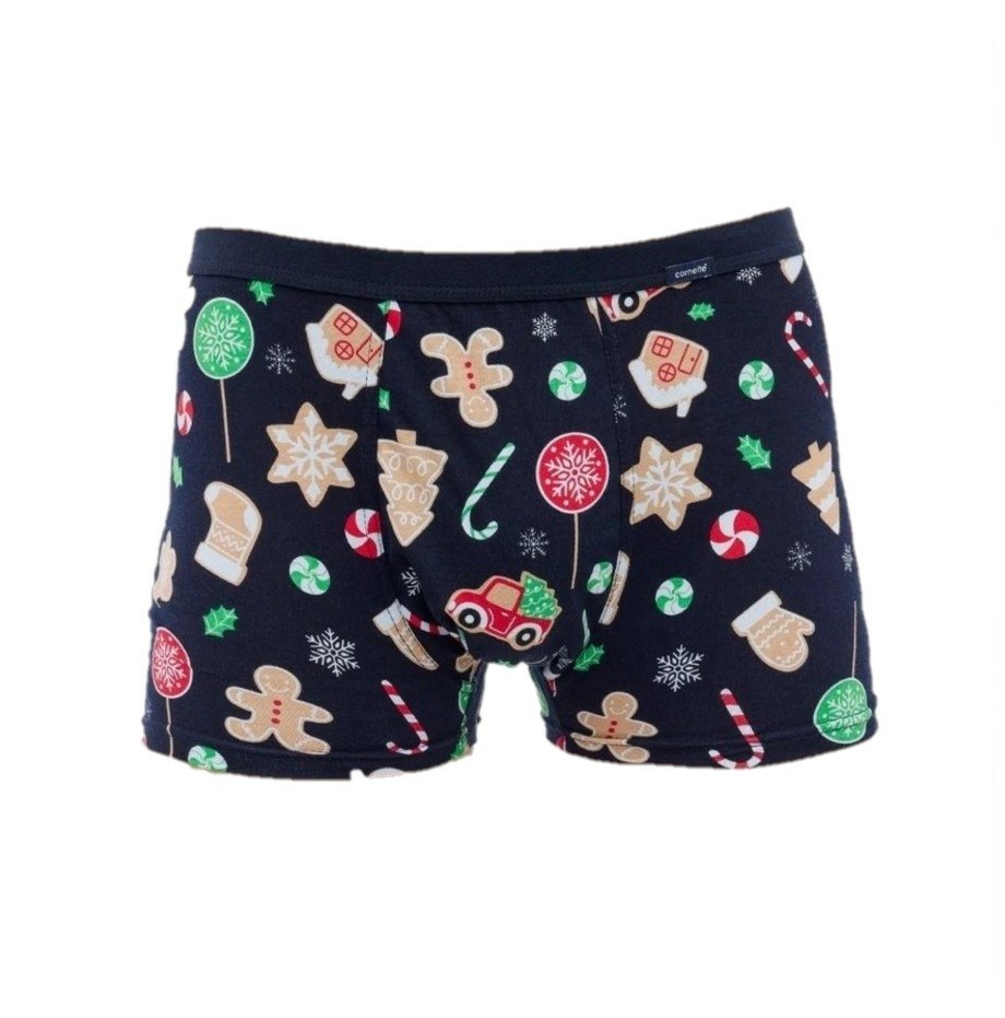 Pánské bavlněné boxerky CORNETTE - Candy s vánočním tiskem na tm.modrém základě, v pase ukončené do obšívané gumy.
