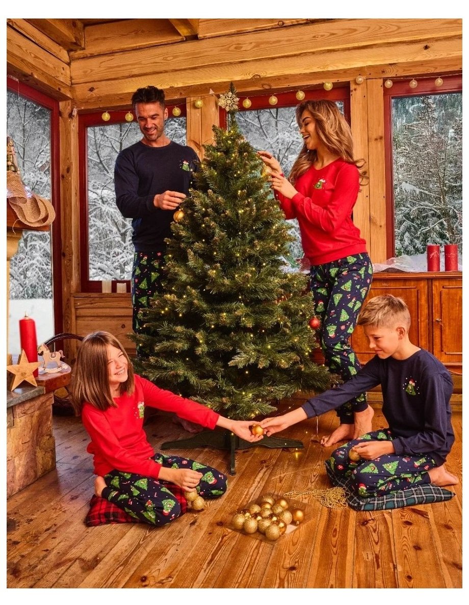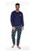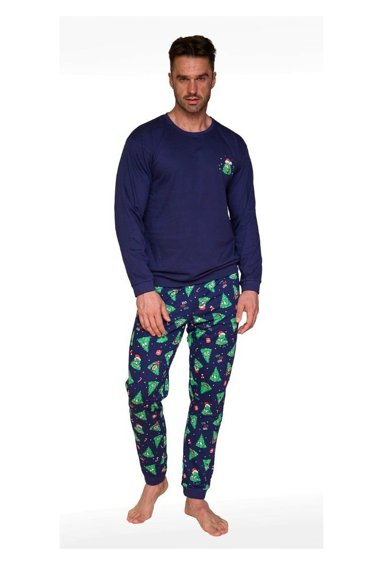Pánské dlouhé bavlněné pyžamo CORNETTE - Christmas tree s tiskem veselých stromečků na tm.modrém základě. Kalhoty jsou celotištěné s gumou v pase, bez kapes s nohavicemi ukončenými do lemu. Horní jednobarevný díl s kulatým výstřihem je zdobený originálním tiskem s rukávy do lemu.
