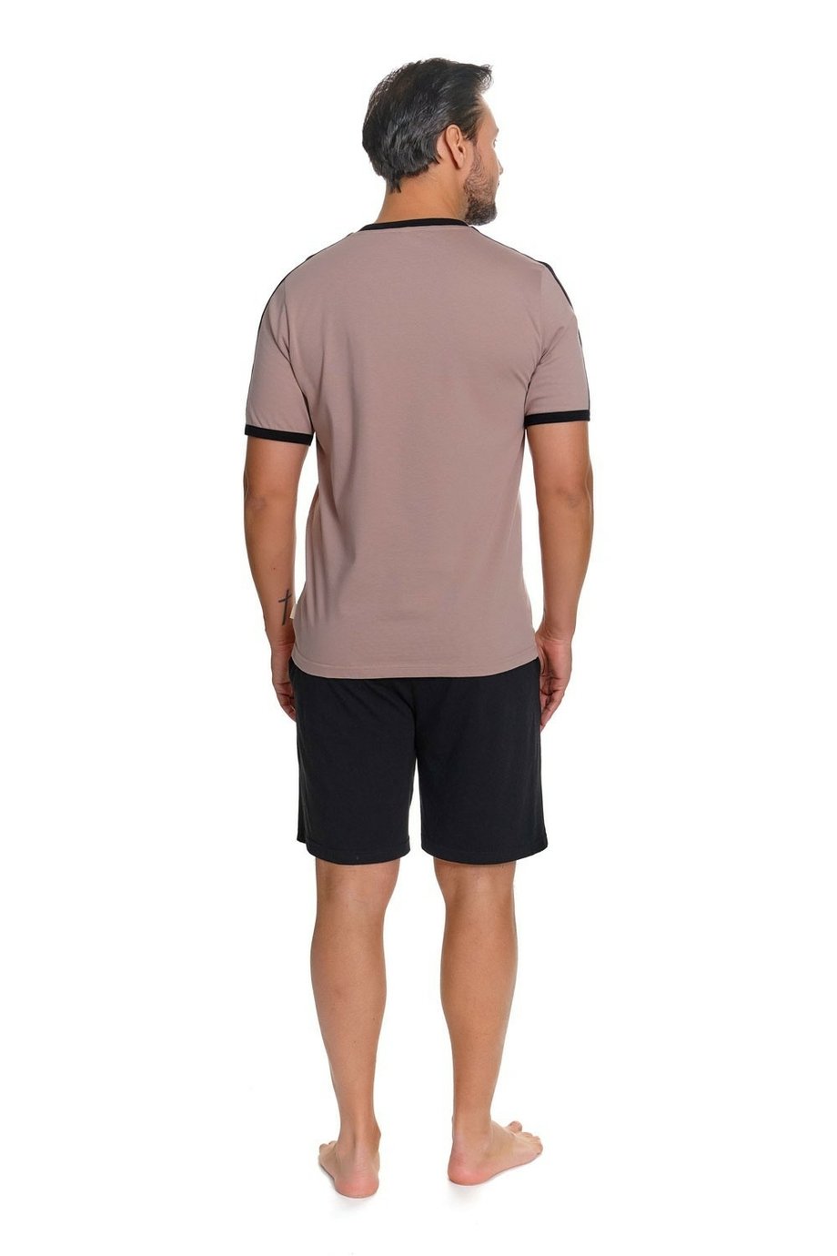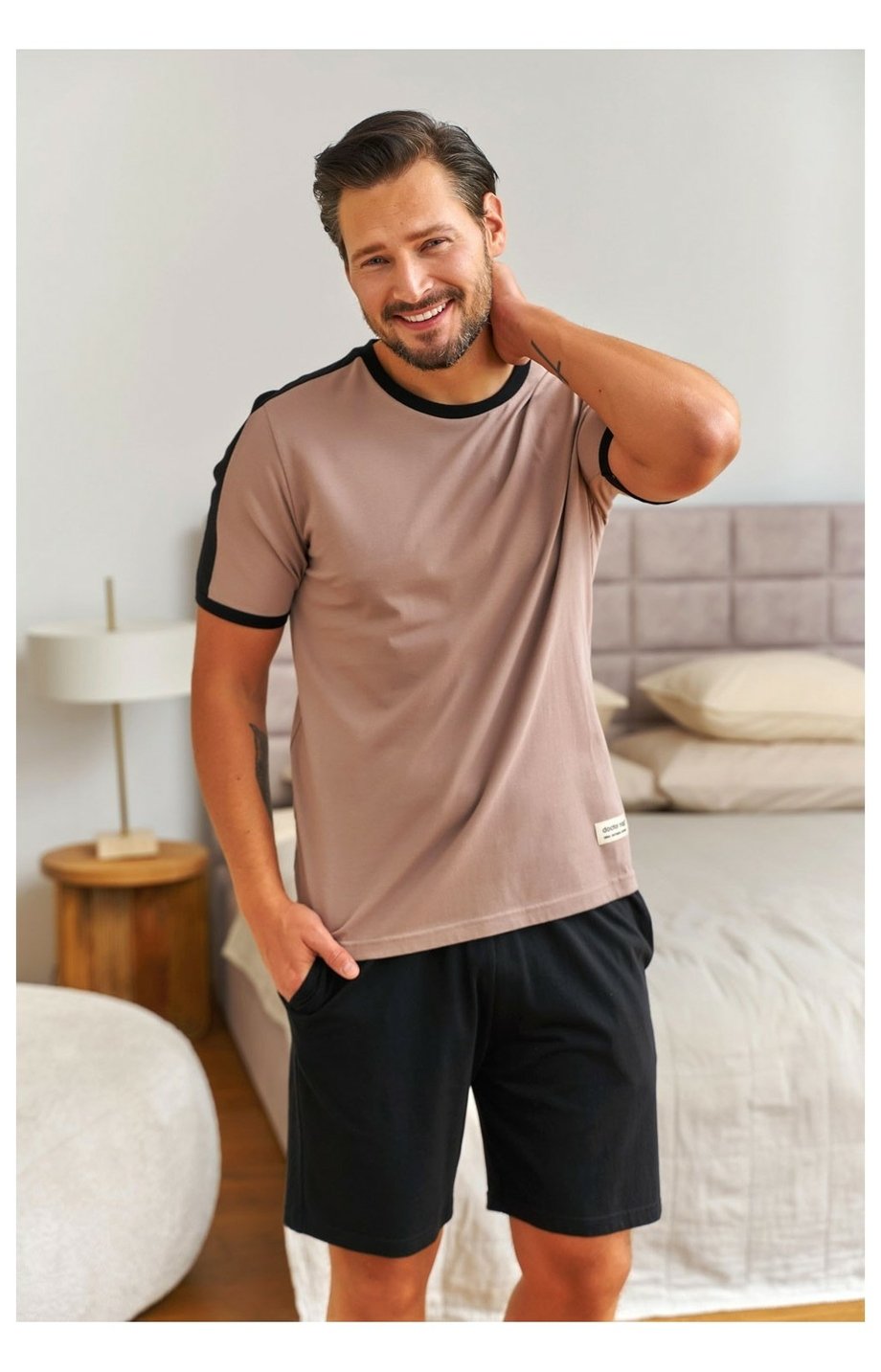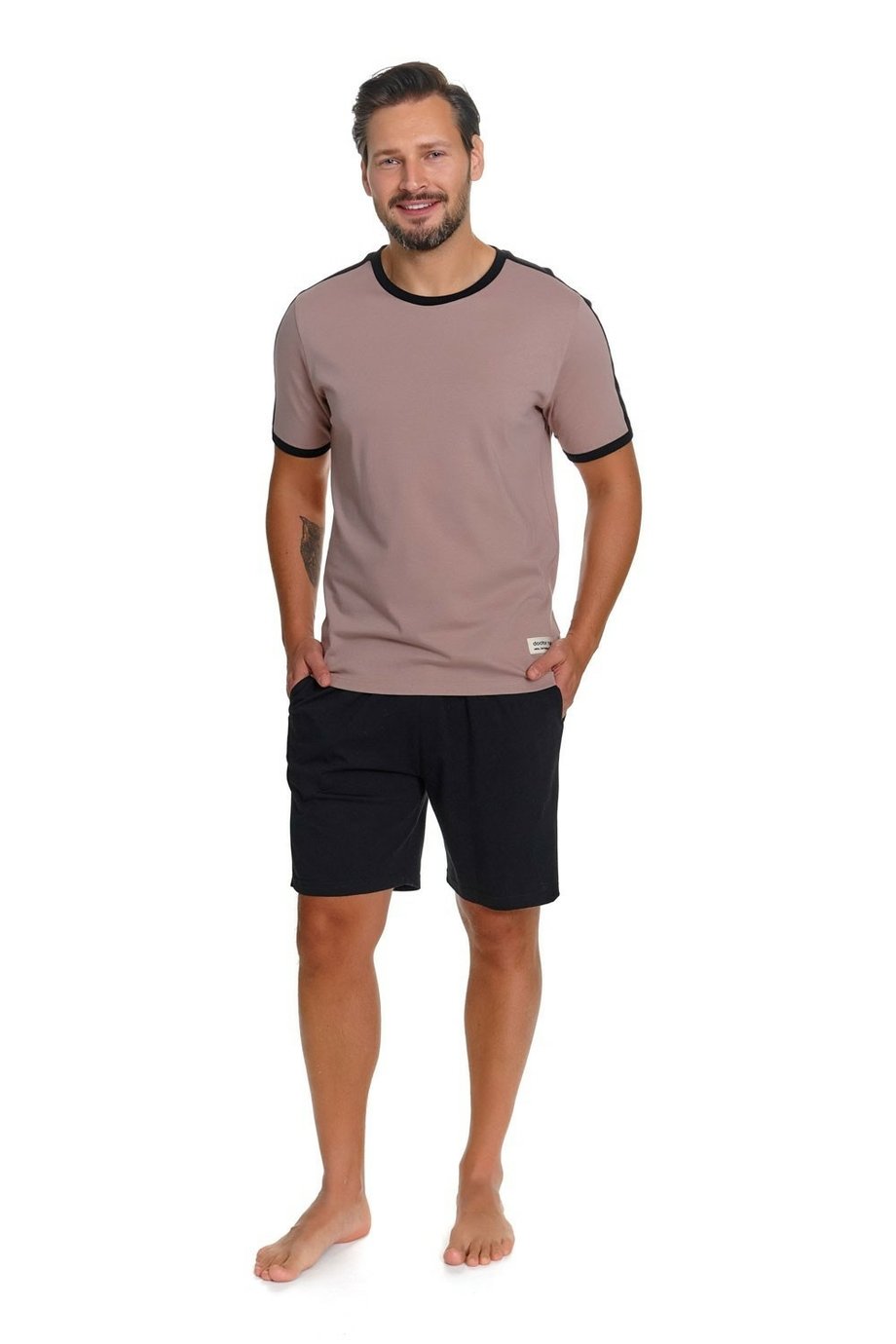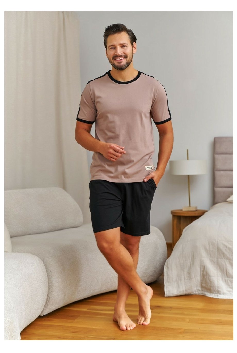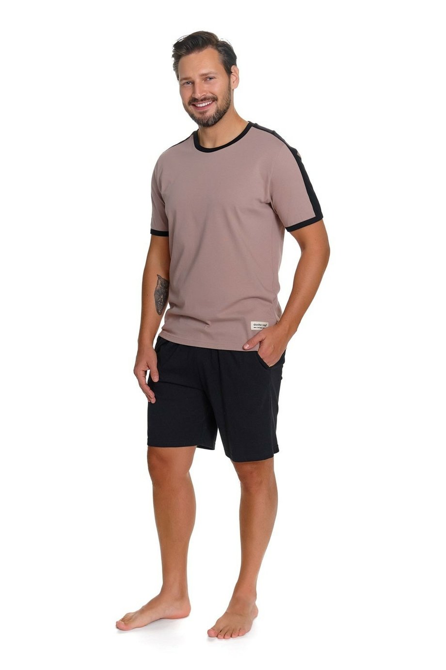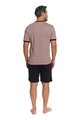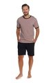 Pánské krátké bavlněné pyžamo DOCTOR NAP s kulatým výstřihem. Horní díl je béžový s kontrastním lemovaním u výstřihu a na rukávech. Kraťasy jsou černé, s gumou v pase a kapsami ve švech.