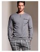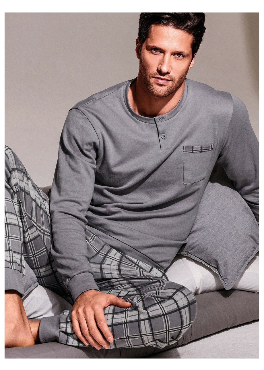 Pohodlné dlouhé pánské pyžamo INFIORE s kulatým výstřihem a rozepínací légou se 2 knoflíčky pro kvalitní spánek a volný čas. Na vzorovaných kalhotách je v pase guma se šňůrkou na stažení, dvě kapsy a nohavice ukončené do lemu. Horní díl je zdobený malou kapsičkou s kontrastním lemem.