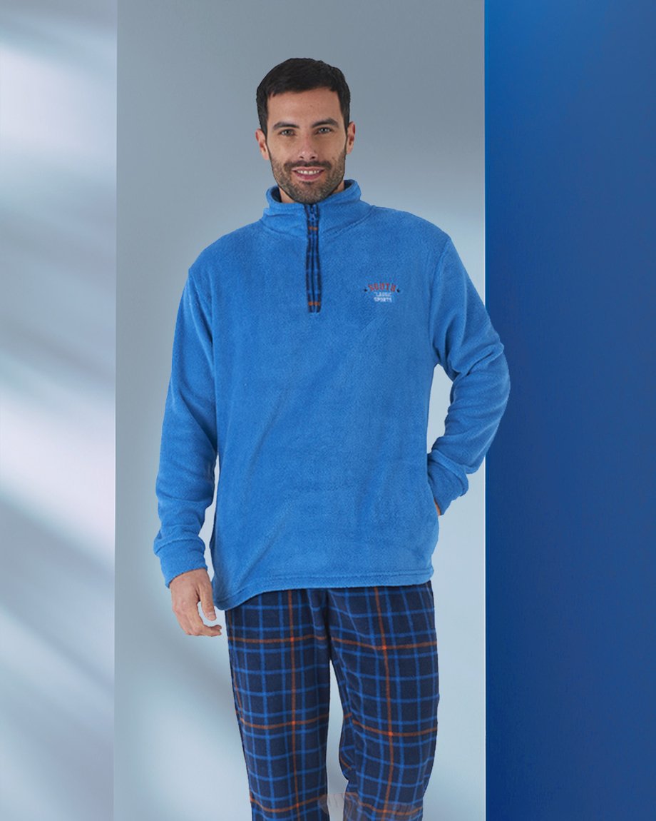 Pánské hřejivé pyžamo nebo domácí komplet KARELPIU. Horní díl má u krku stojáček se zipem, malou výšivku a na bocích dvě kapsy. Rukávy a nohavice jsou ukončeny do lemu.