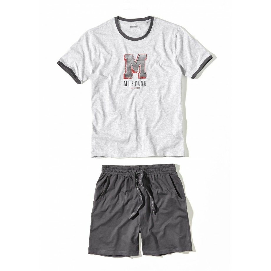 Pánské bavlněné pyžamo MUSTANG s krátkým rukávem a kraťasy. Kraťasy jsou jednobarevné s kapsami a šňůrkou v pase na stažení. Triko s kulatým výstřihem je zdobené originálním obrázkem na předním díle a výstřih a rukávy jsou kontrastně lemovány.
