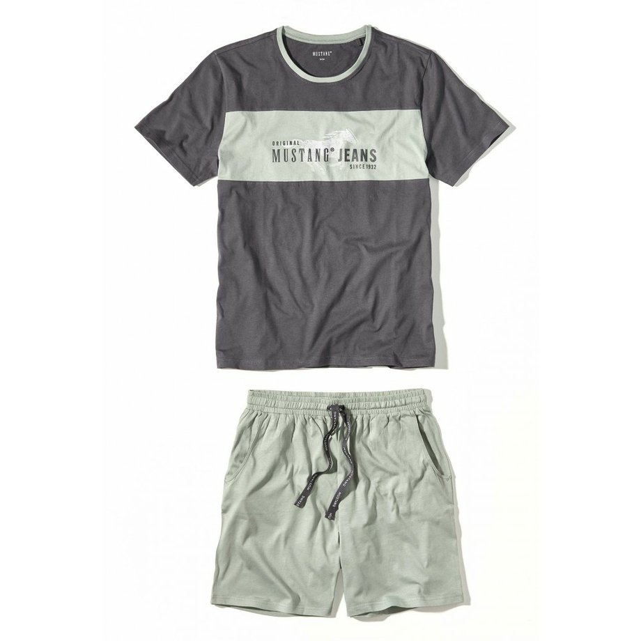 Pánské bavlněné pyžamo MUSTANG s krátkým rukávem a kraťasy. Kraťasy jsou jednobarevné s kapsami a šňůrkou v pase na stažení. Triko je zdobené originálním obrázkem na předním díle a kulatý výstřih je kontrastně lemován.