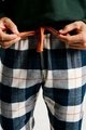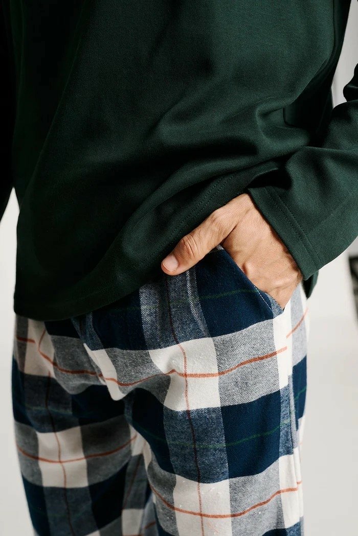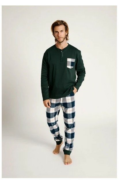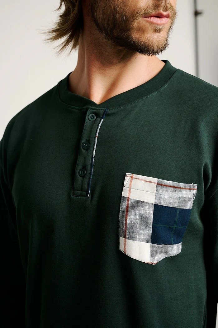 Pánské dlouhé bavlněné pyžamo MUYDEMI. Kalhoty jsou kostkované v pase do gumy s kontrastní šňůrkou na stažení, dvěma kapsami a nohavicemi ukončenými do lemu. Horní díl je jednobarevný s kulatým výstřihem s rozepínací légou s knoflíčky a našitou kontrastní kapsou.