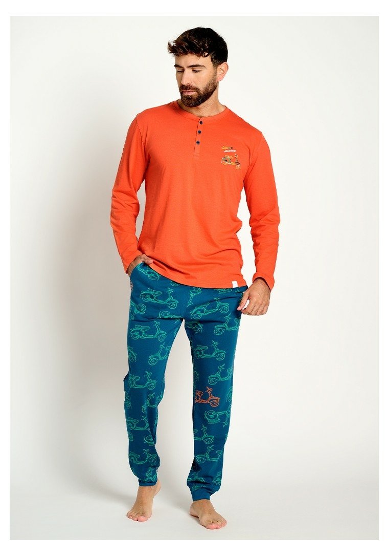 Pánské dlouhé bavlněné pyžamo MUYDEMI s kulatým výstřihem a rozepínací légou se 3 knoflíčky. Kalhoty mají v pase gumu a šňůrku ke stažení, 2 kapsy a jsou zdobené tiskem barevných skútrů. Nohavice jsou ukončeny do lemu. Horní díl zdobí malý obrázek skútru.