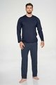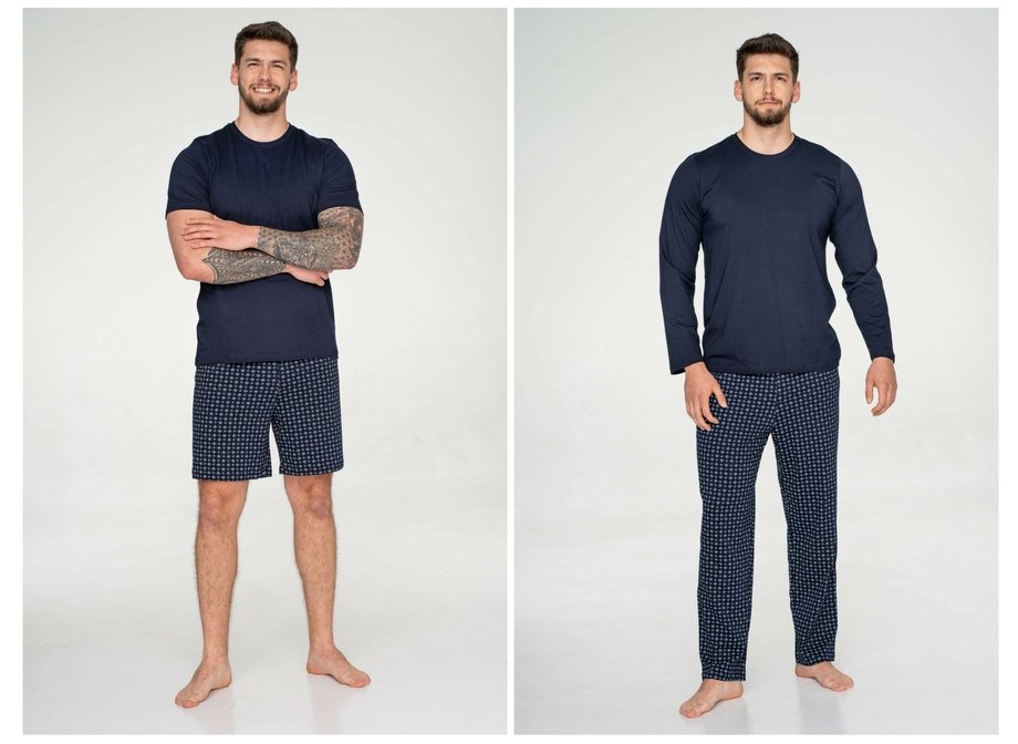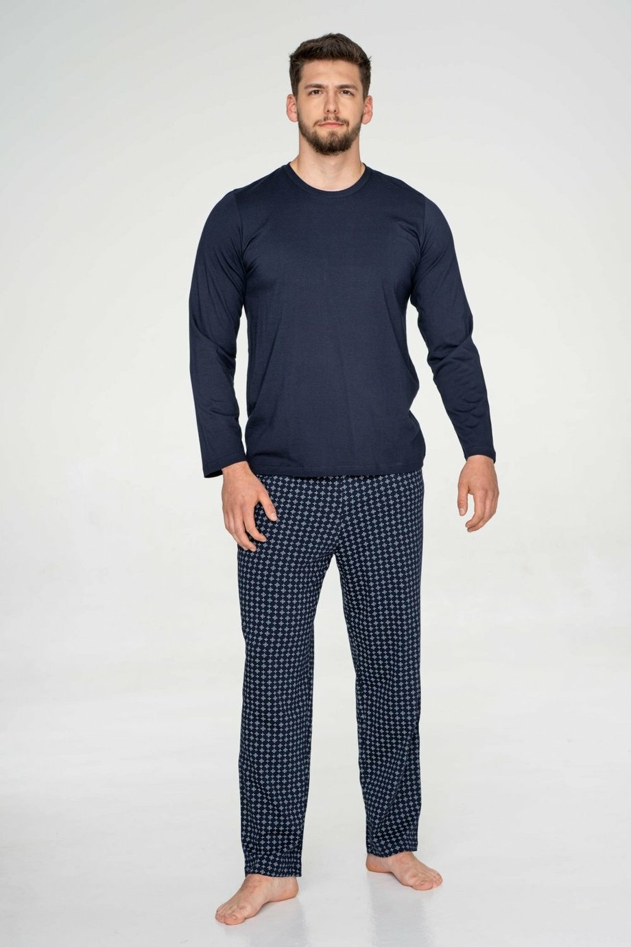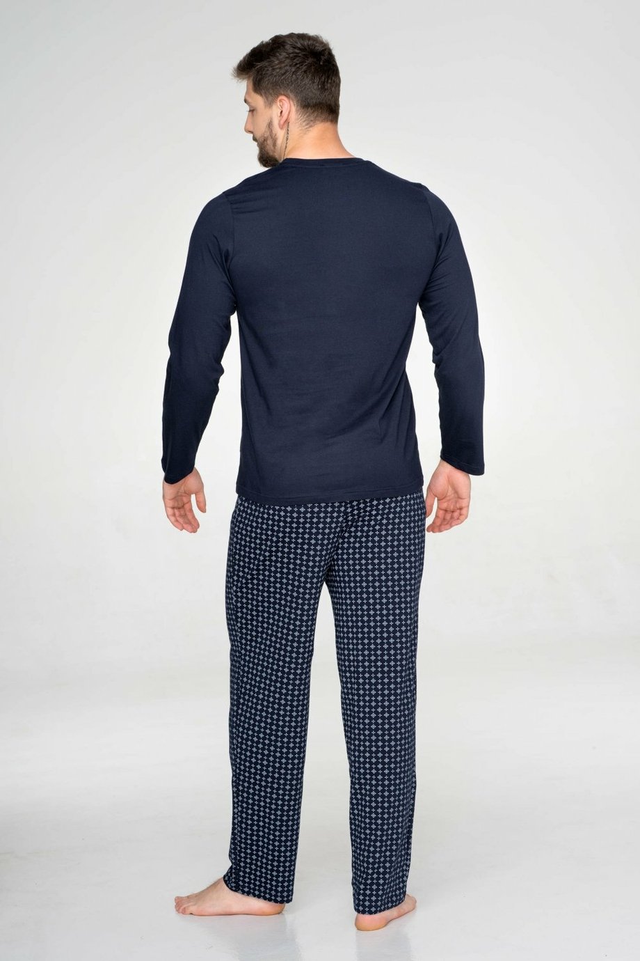 Pánské dlouhé bavlněné pyžamo TIMO - Mens cross s kulatým výstřihem. Kalhoty jsou celotištěné drobným vzorem na tm.modrém základě a v pase mají gumu. Pyžamo je ideální pro klidný spánek nebo pohodové večery doma.